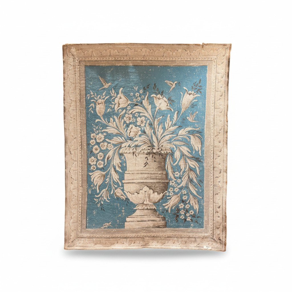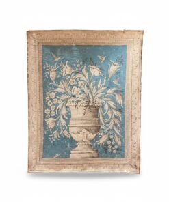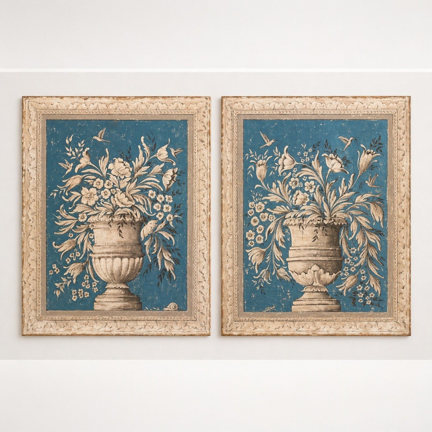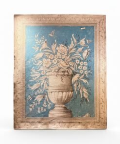 Elegant and decorative, this pair of 20th century Italian painted canvases features classical urns overflowing with stylized florals and delicate birds, set against a rich blue ground. The compositions are beautifully balanced, with graceful movement in the foliage and a soft, aged palette that highlights their timeless European charm.