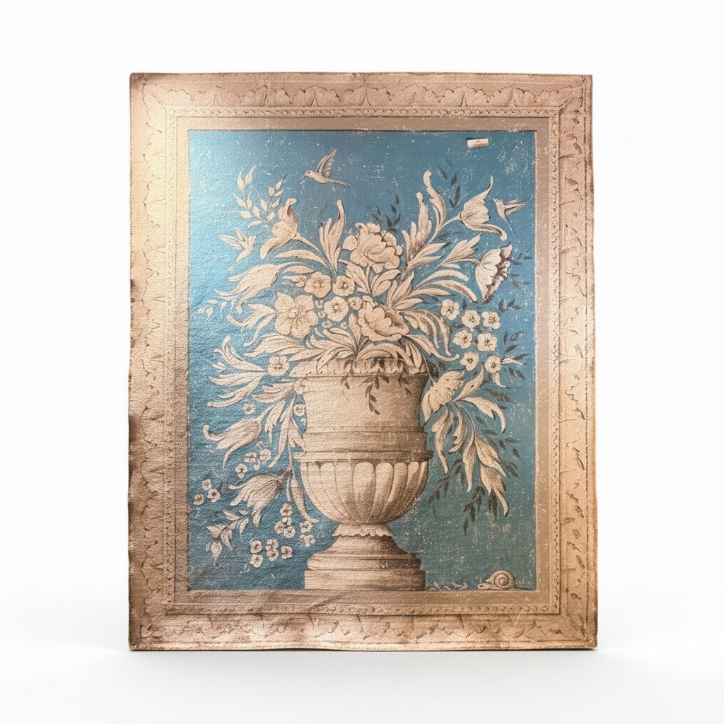 Executed on canvas with a naturally distressed finish, the surfaces display intentional wear, subtle cracking, and patina that enhance their antique character. The trompe-l’oeil border adds depth and a framed illusion, while remaining unframed for a relaxed, versatile presentation.
