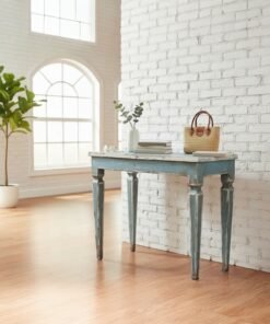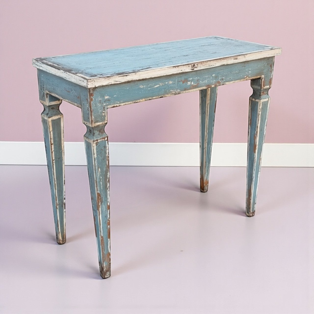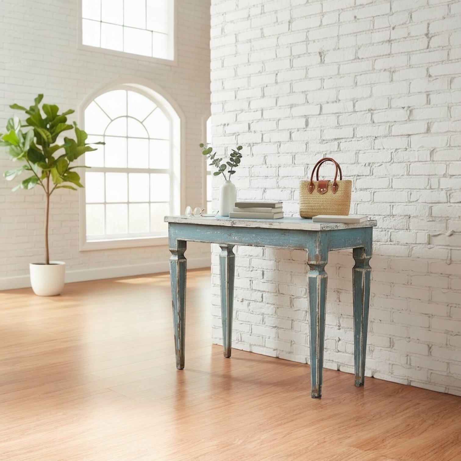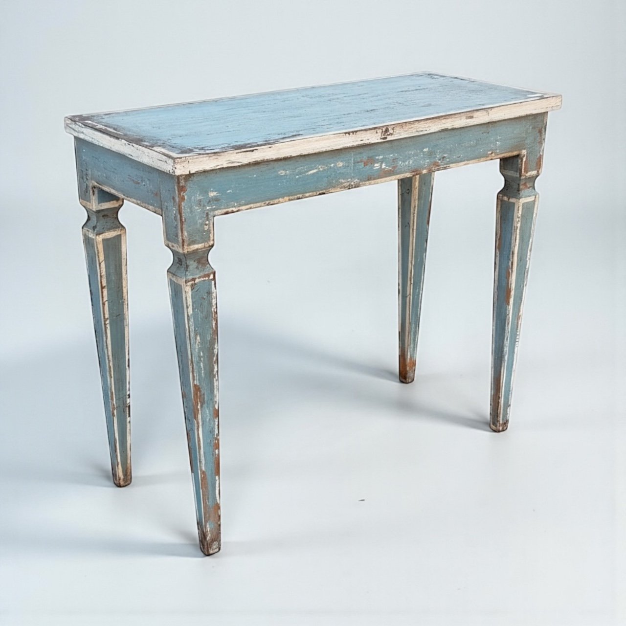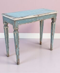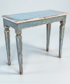 A beautifully distressed blue painted console table with elegant tapered legs and carved detailing. Its weathered finish reveals hints of natural wood beneath, giving it authentic vintage charm and a soft, timeworn character.