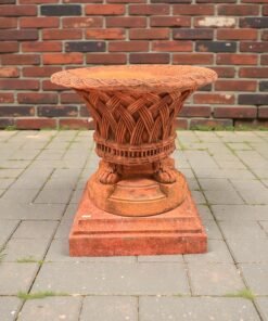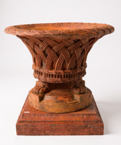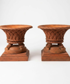 This elegant pair of basketweave planters on low plinths is crafted from terracotta-colored composition stone and inspired by the historic originals at Harewood House in West Yorkshire, England. Each ornate planter features a generously flared bowl with a beautifully detailed basket-weave pattern and stands on sculptural lion-claw feet, creating a striking classical silhouette.