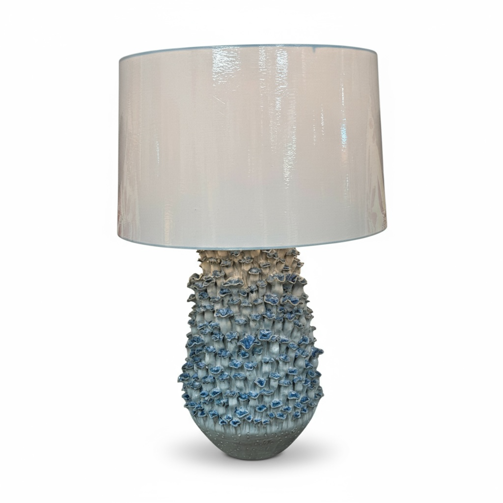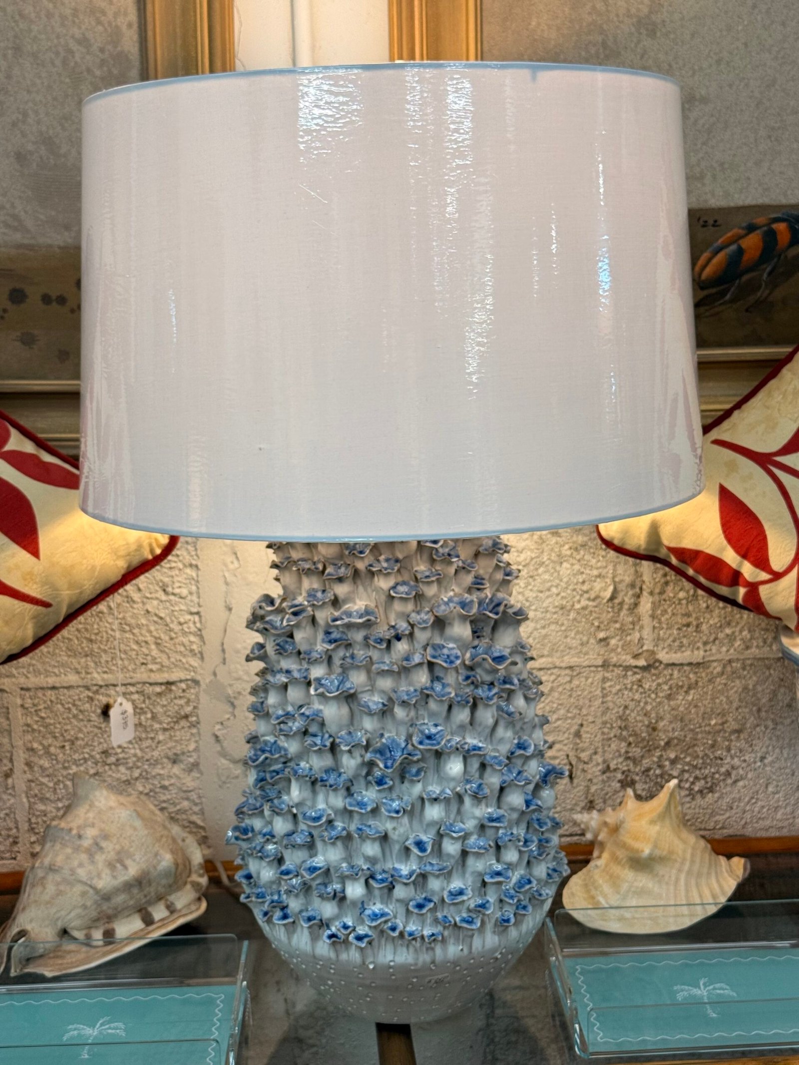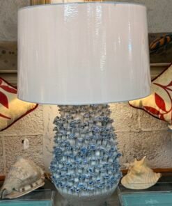 A blue and white barnacle-style ceramic lamp with sculpted textured detailing, sold with shade included and wired for electricity. A coastal-chic statement piece that adds dimension and style to any room.