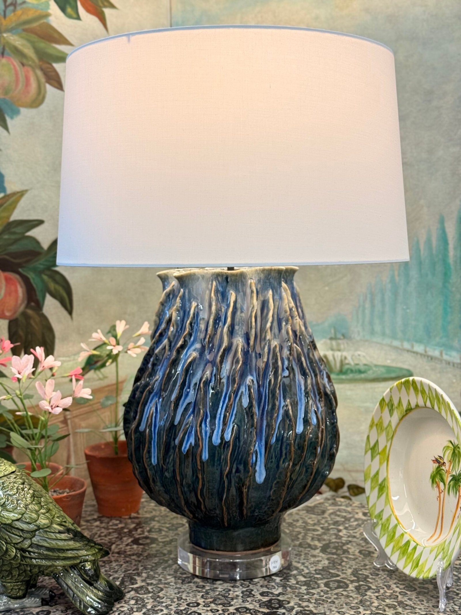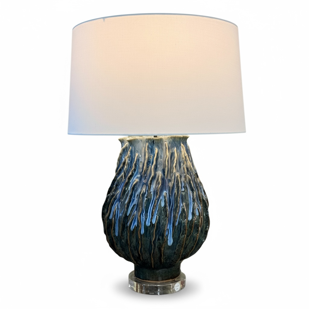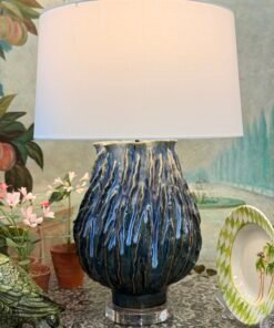 Blue Original Thai Ceramic with Wavy Design Table Lamp, a stunning addition to elevate your home decor. The lamp features an 11″x 20″ ceramic base meticulously crafted in Thailand, showcasing a unique wavy design that adds a touch of artistic flair to any space. Topped with an elegant 18″ wide and 9″ high shade, the entire lamp stands at a graceful 24″ in height. This exquisite lamp is the perfect fusion of contemporary style and traditional craftsmanship, sure to captivate and illuminate your living space. A must-have for those seeking timeless beauty and functionality.