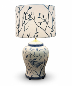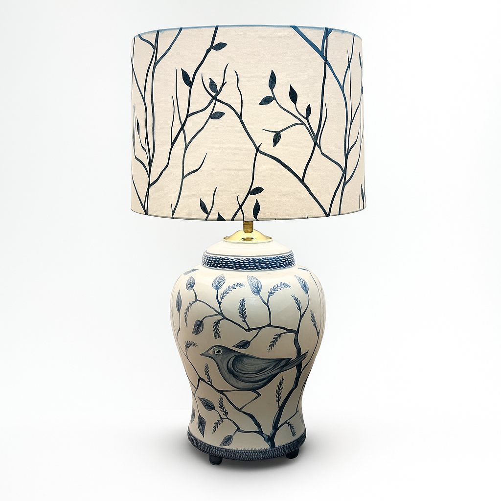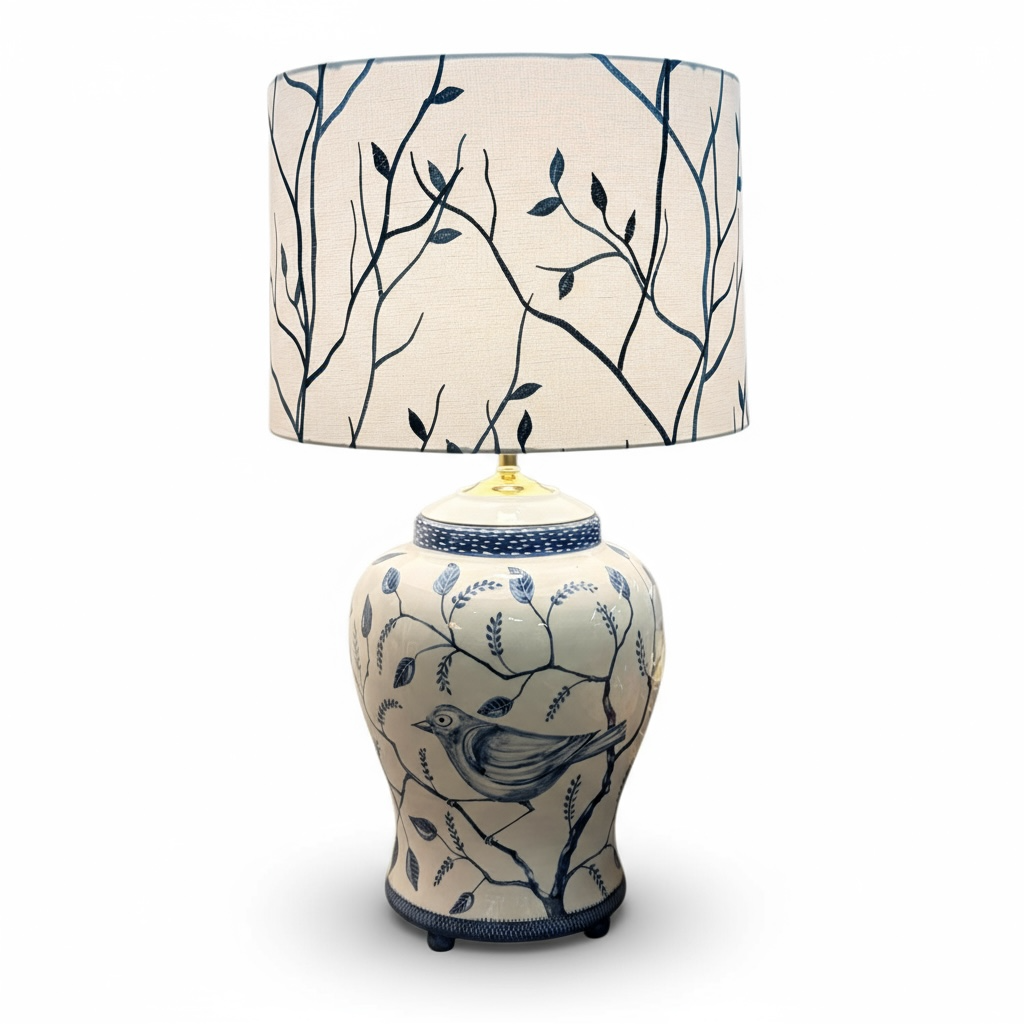 Charming blue and white ceramic table lamp featuring a hand-painted bird and branch motif, paired with a coordinating botanical shade for a cohesive and elegant look. A timeless accent perfect for coastal, cottage, or classic interiors.