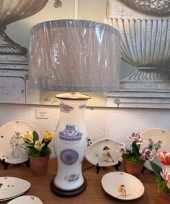 Elegant porcelain table lamp featuring classic blue and white chinoiserie designs, set on a wooden base. Wired for electricity and sold with fabric shade included. A timeless accent for any room.