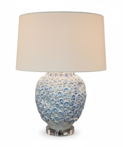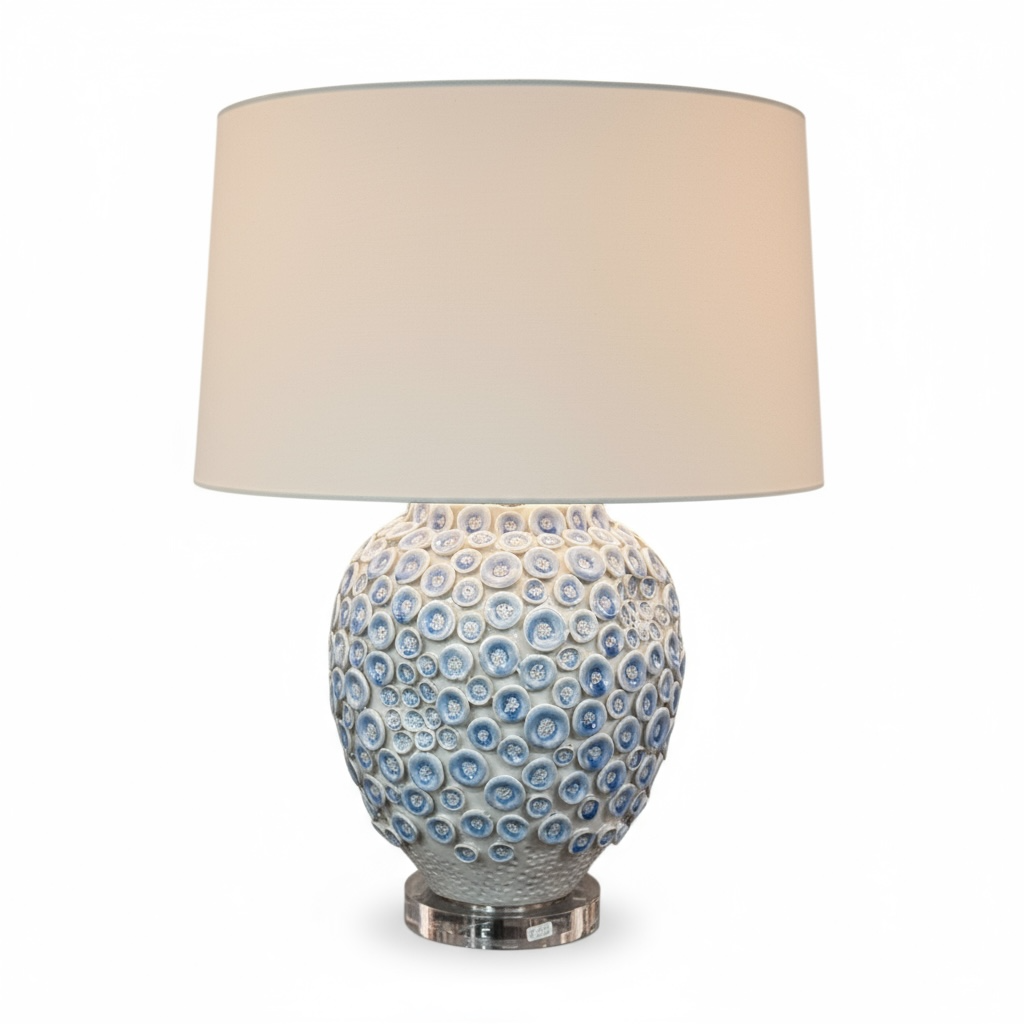 Stylish ceramic table lamp featuring a raised circular textured design in soft blue and white tones. Set on a clear acrylic base for a modern coastal touch, this piece adds both texture and refinement to any room. Perfect for living rooms, bedrooms, or entryway consoles.