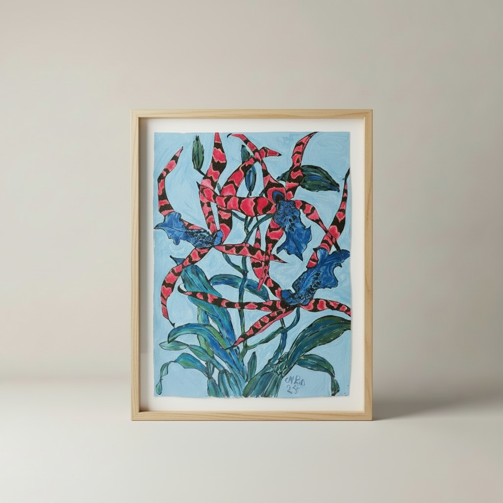 A vivid pair of orchid paintings by Christian Peltenburg-Brechneff, Night Fairy Tale Orchid I & II celebrates the dreamlike beauty of exotic orchids through rich color and expressive brushwork. The compositions feel almost fantastical, with luminous hues and fluid forms that evoke a magical nighttime garden.