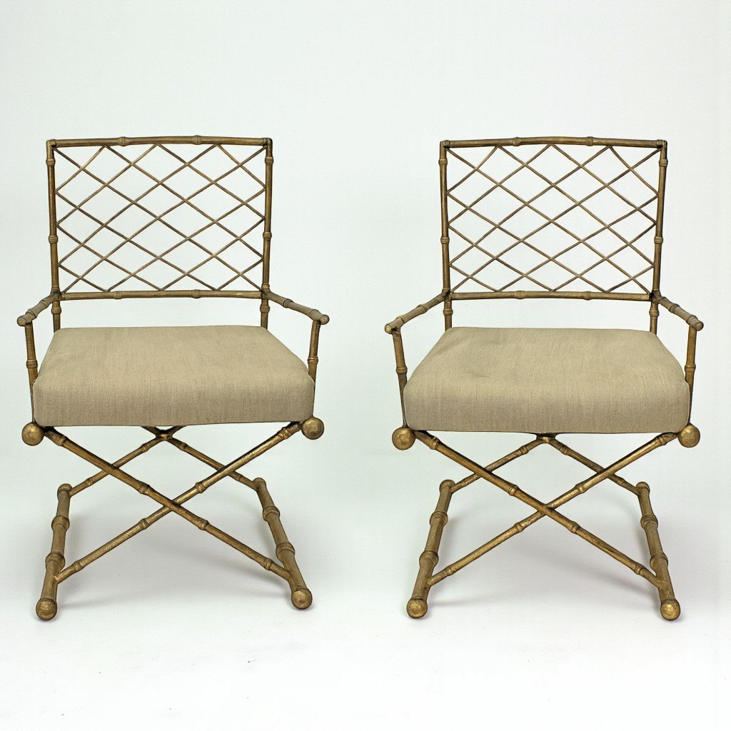 Elegant pair of French-style armchairs featuring an intricate faux-bamboo lattice back and cross-form legs, crafted in gilt iron for a refined yet timeless appeal. Each chair is topped with a neutral upholstered seat cushion in textured linen, offering both comfort and sophistication. The design captures a blend of neoclassical and mid-century influences, making them ideal for use as accent chairs in a salon, entryway, or covered patio setting.