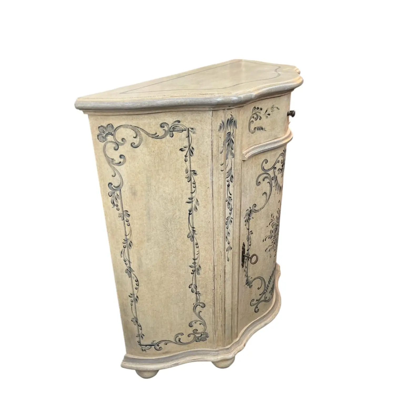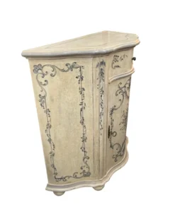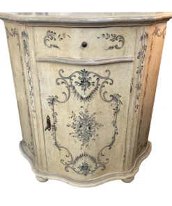 Beautiful French Provincial Bombe Chest featuring an Antiqued Cream finish. Its signature serpentine curves and distressed patina add a touch of romance to any room. Perfect for use as an accent cabinet, entryway piece, or unique nightstand. The hand-painted floral motifs and contrasting gray top complete its charming, vintage look.
