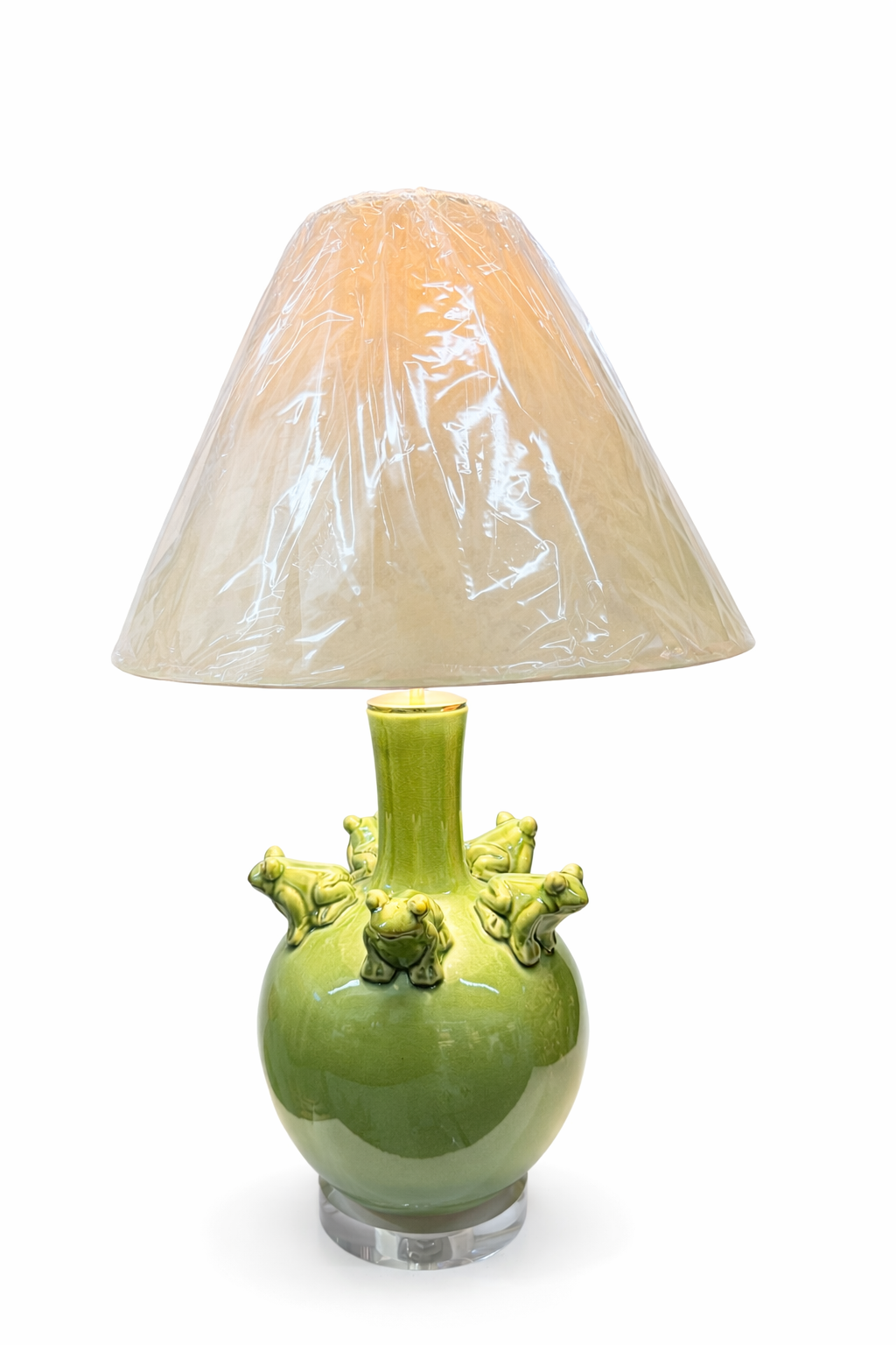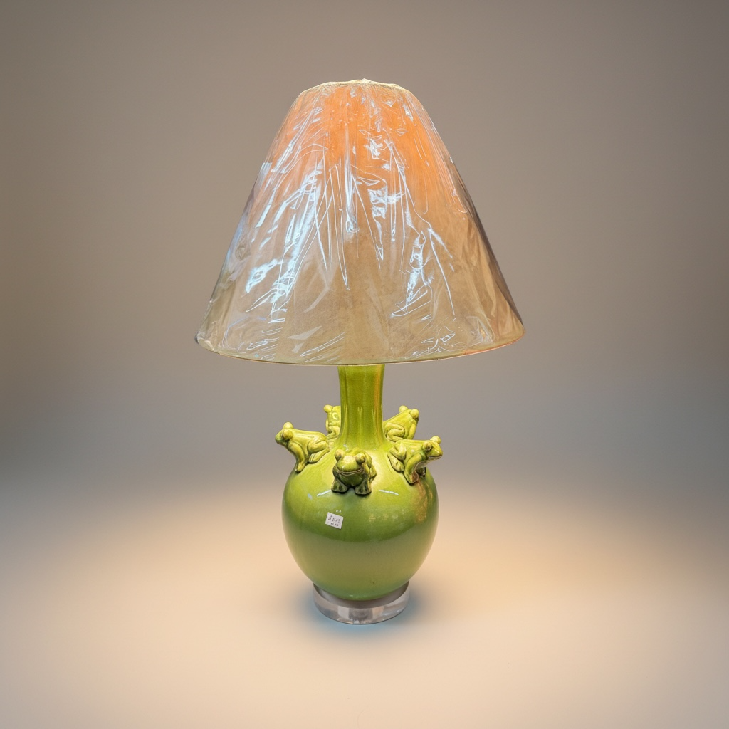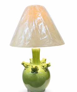 Playful ceramic lamp in a vibrant green glaze, featuring sculpted frogs around the base. A fun yet stylish accent, perfect for adding character to any space.
