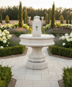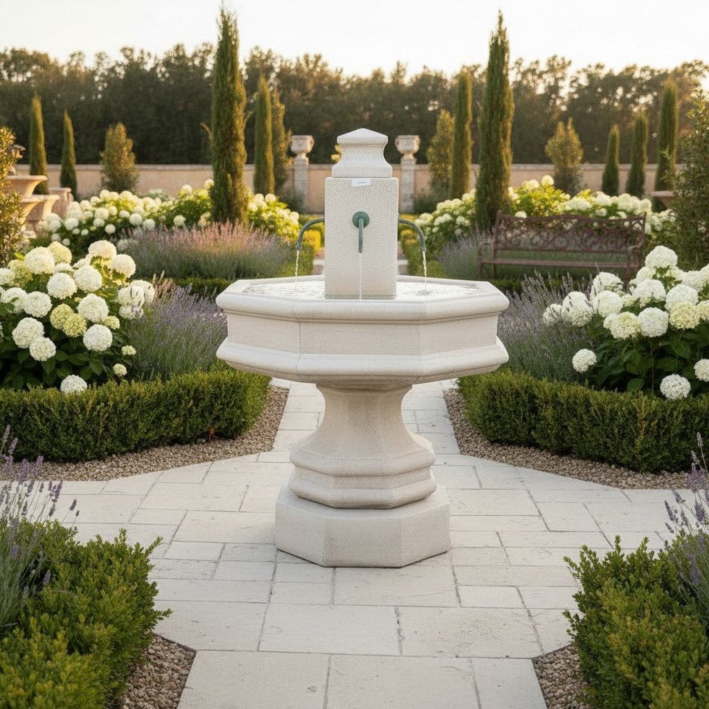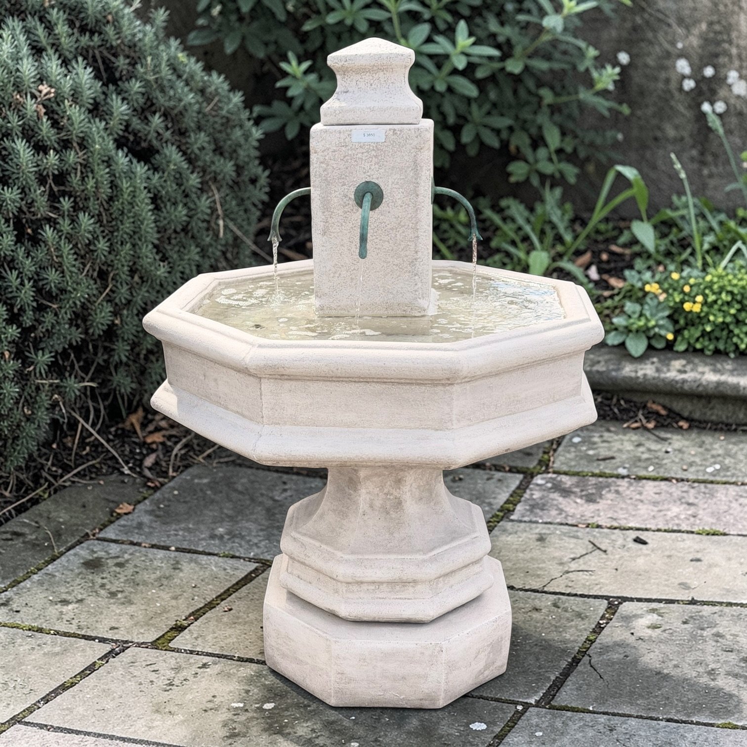 Elegant tiered garden fountain with a classic octagonal basin and central column, finished in a soft French wax tone. Features dual water spouts for a balanced, tranquil flow—perfect as a focal point in a formal garden or courtyard.