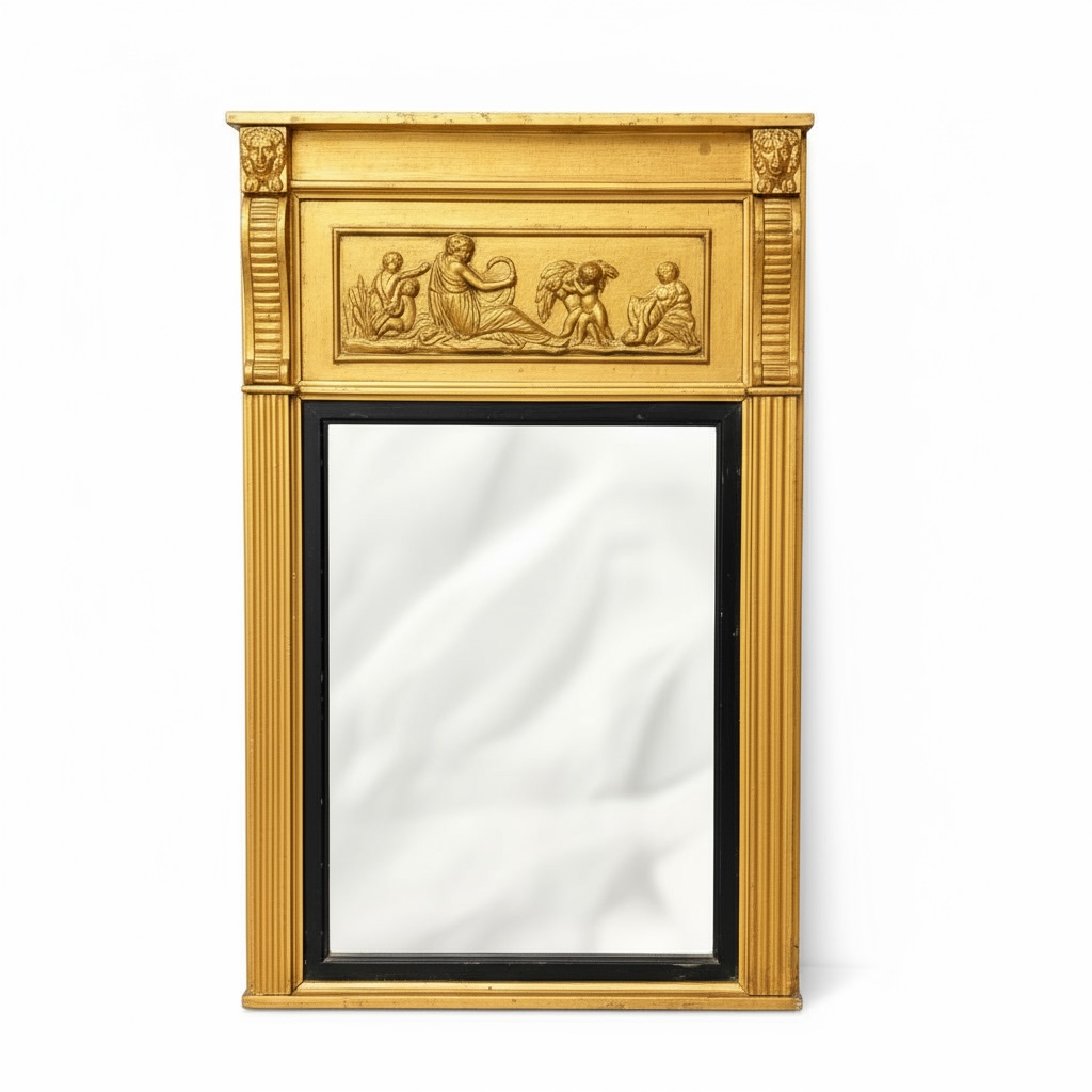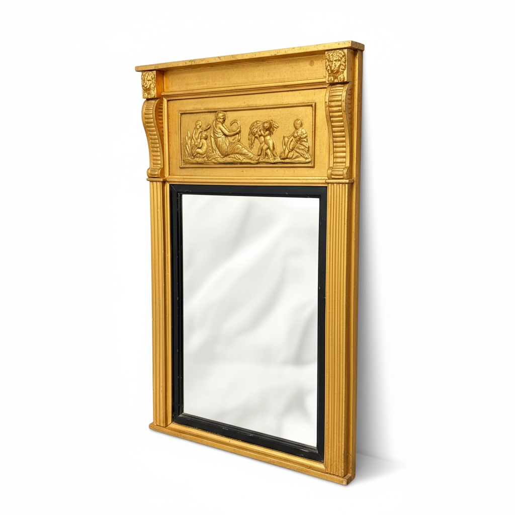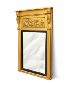 A beautifully detailed wooden mirror featuring a richly carved, gilt-finished frame crowned with a classical figural frieze. The upper panel displays a raised relief scene with flowing drapery and cherub-style figures, framed by fluted vertical columns and decorative corner blocks. A contrasting inner black border surrounds the mirror plate, adding depth and definition to the piece.