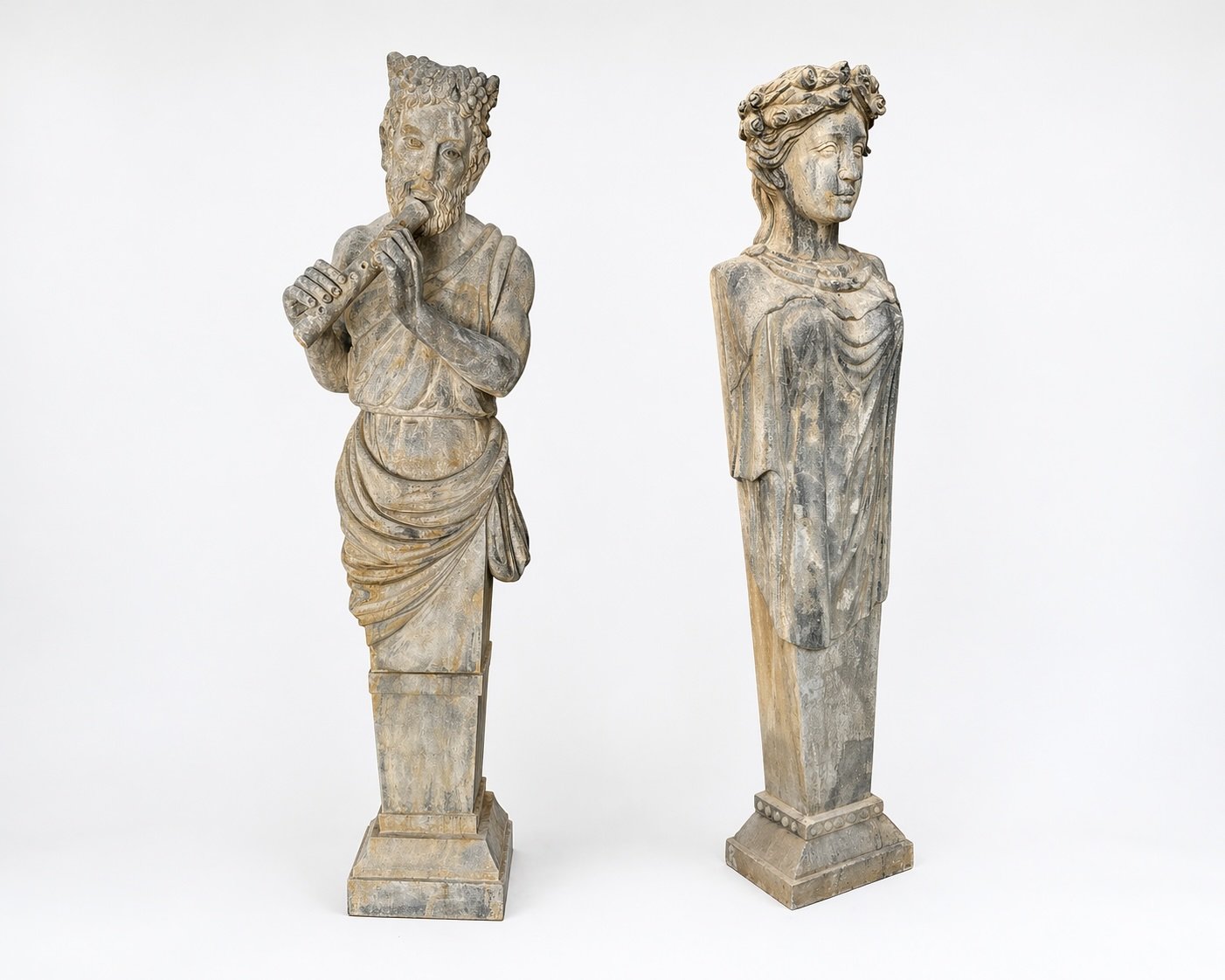 Imposing and finely carved Neoclassical garden term (herm) statues, each hand-carved from solid granite and standing at an impressive scale. The female figure—likely Flora, Roman goddess of flowers—emerges gracefully from a tapering plinth, crowned with high-relief roses and draped in elegant, flowing garments. The male figure complements with equally strong classical presence and detail.