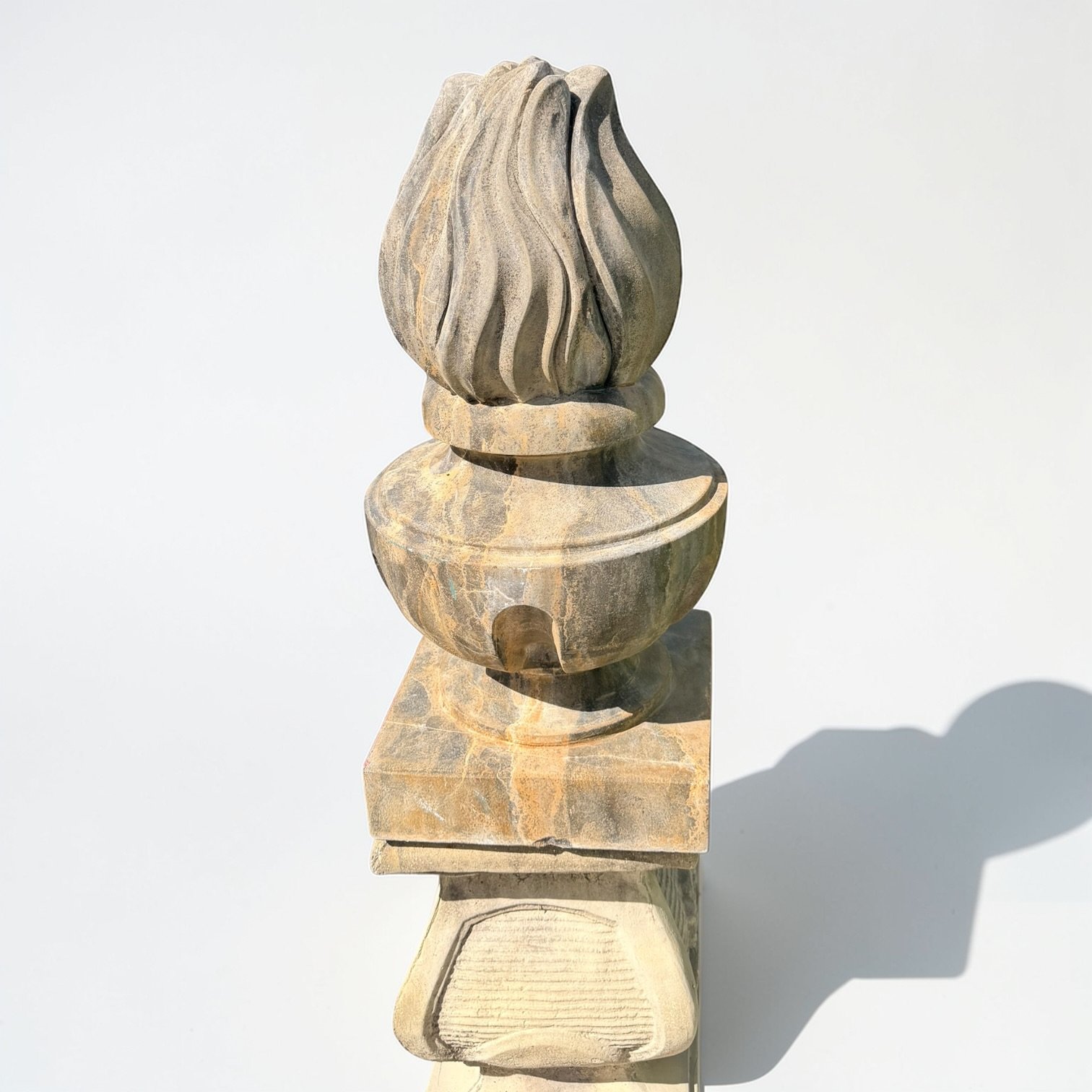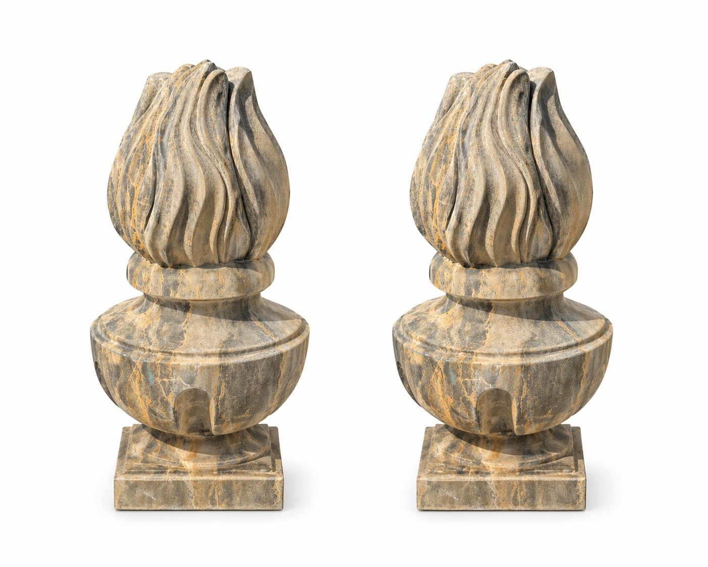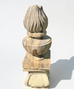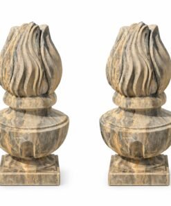 Elegant carved granite finials from the Netherlands, featuring a classic flame form with rich natural veining. A refined architectural accent, perfect for gate posts, pillars, or garden settings.