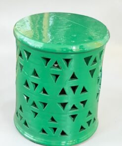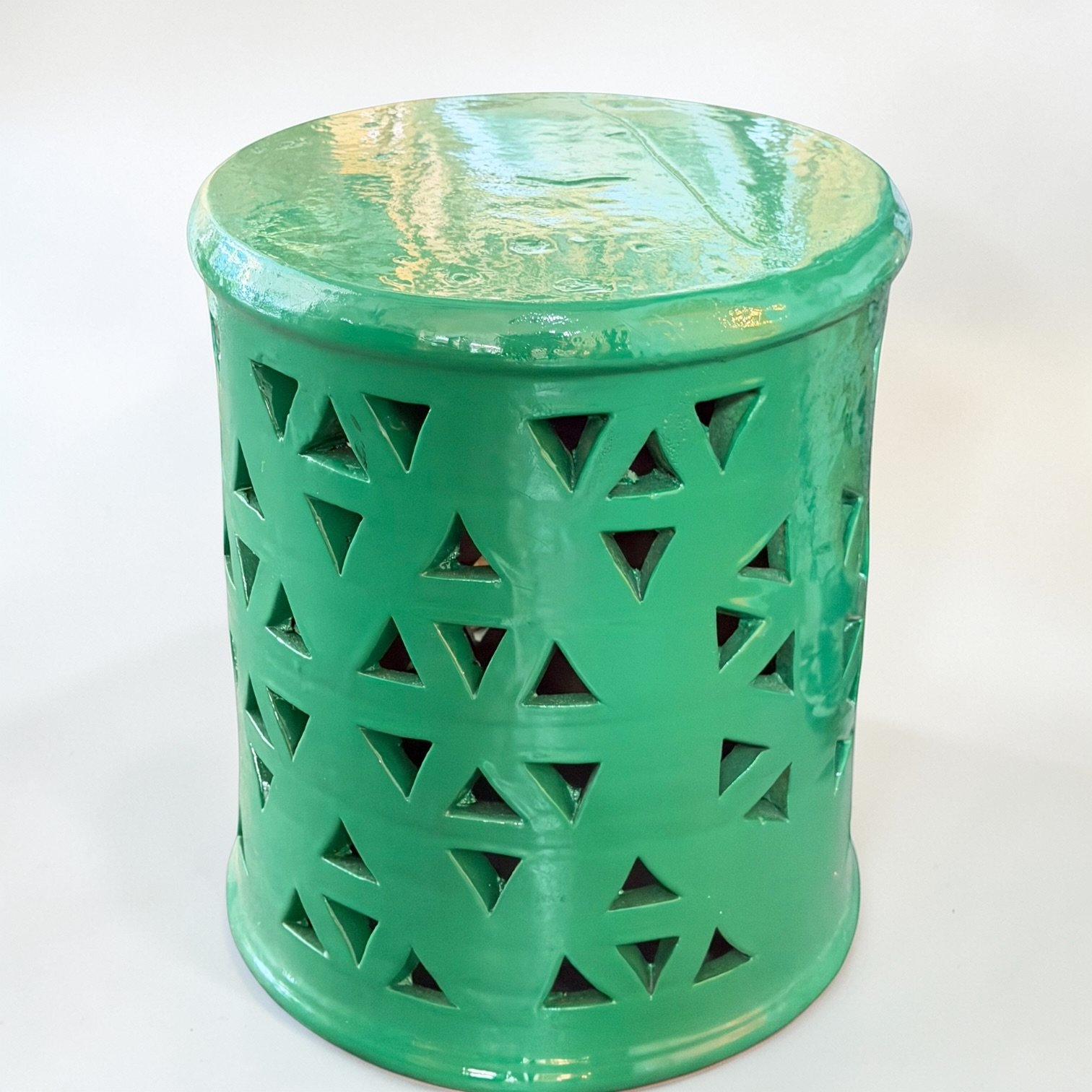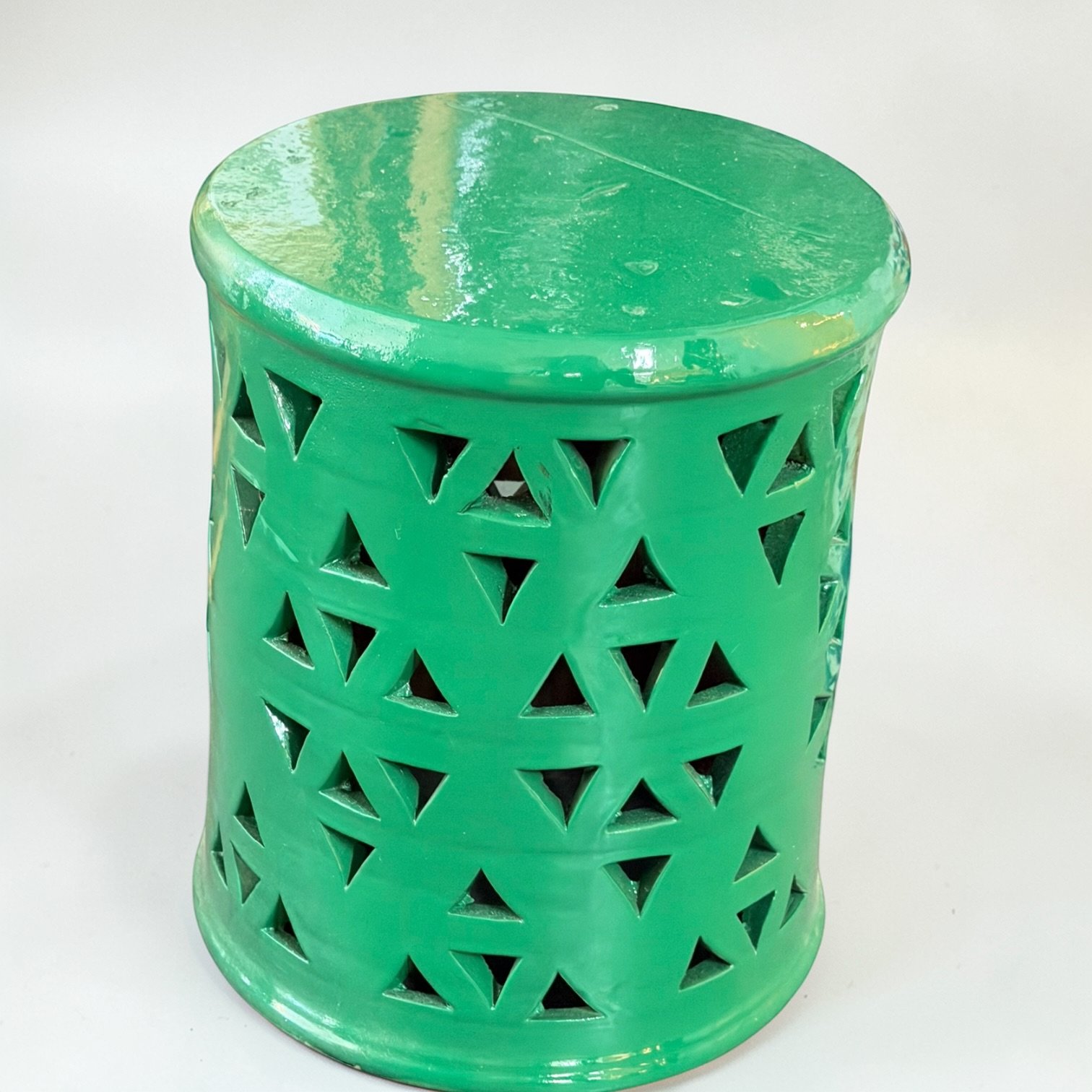 Glossy ceramic garden seat in a vibrant green glaze with geometric cut-out detailing. Perfect as a stool, side table, or accent piece for indoor or outdoor use.
