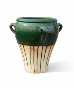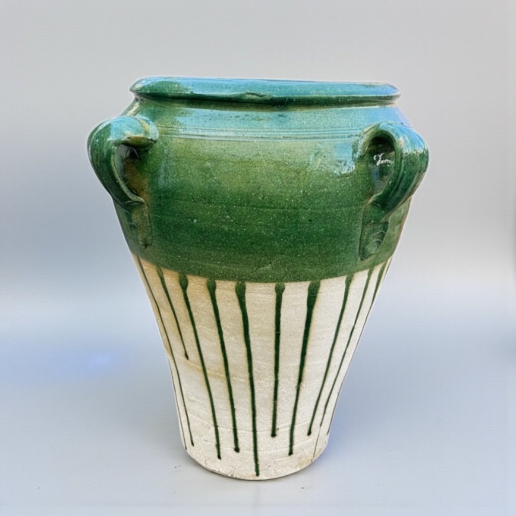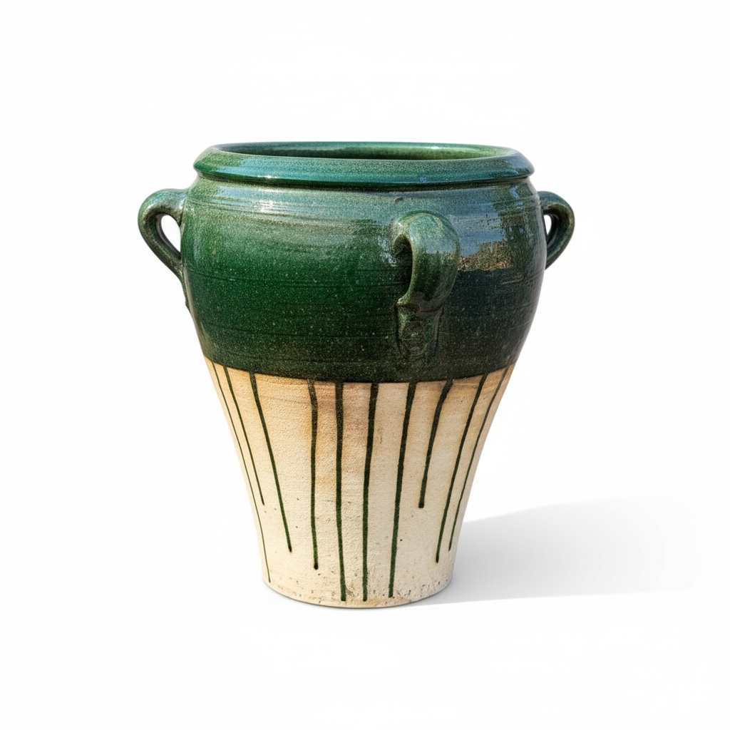 A beautifully crafted green-glazed terracotta vase featuring a classic tapered form and hand-applied vertical drip detailing. The rich green glaze transitions into a natural clay base, giving the piece an organic, artisanal character. Sculpted side handles add charm and traditional craftsmanship.