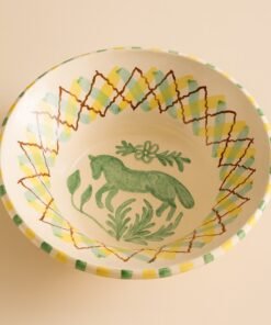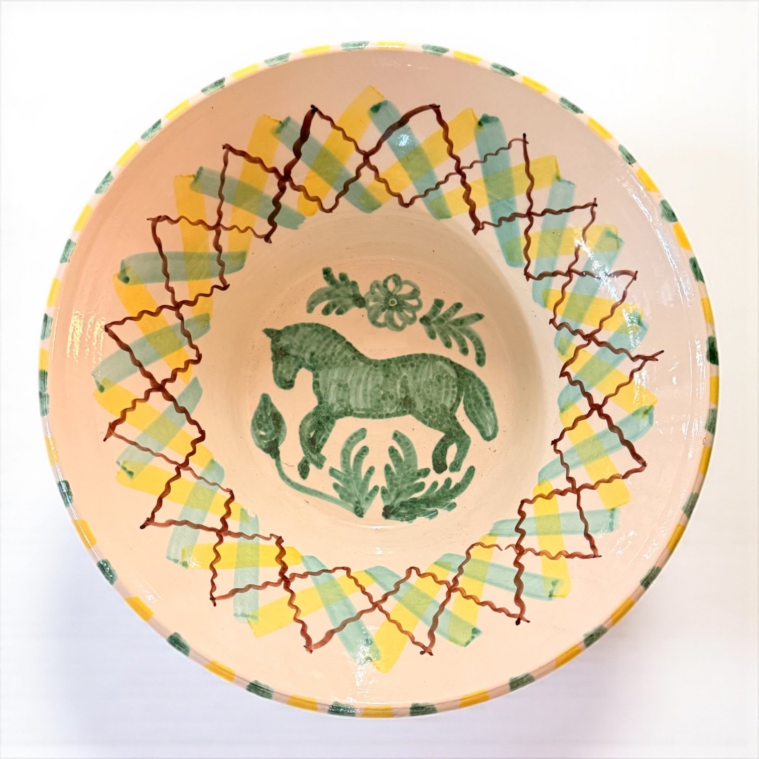 Decorative ceramic wall bowl featuring a central green horse with floral accents, framed by a bold yellow, aqua, and brown diamond-pattern border. Finished with a yellow-and-green checked rim, it brings vibrant folk-art charm to any wall display.