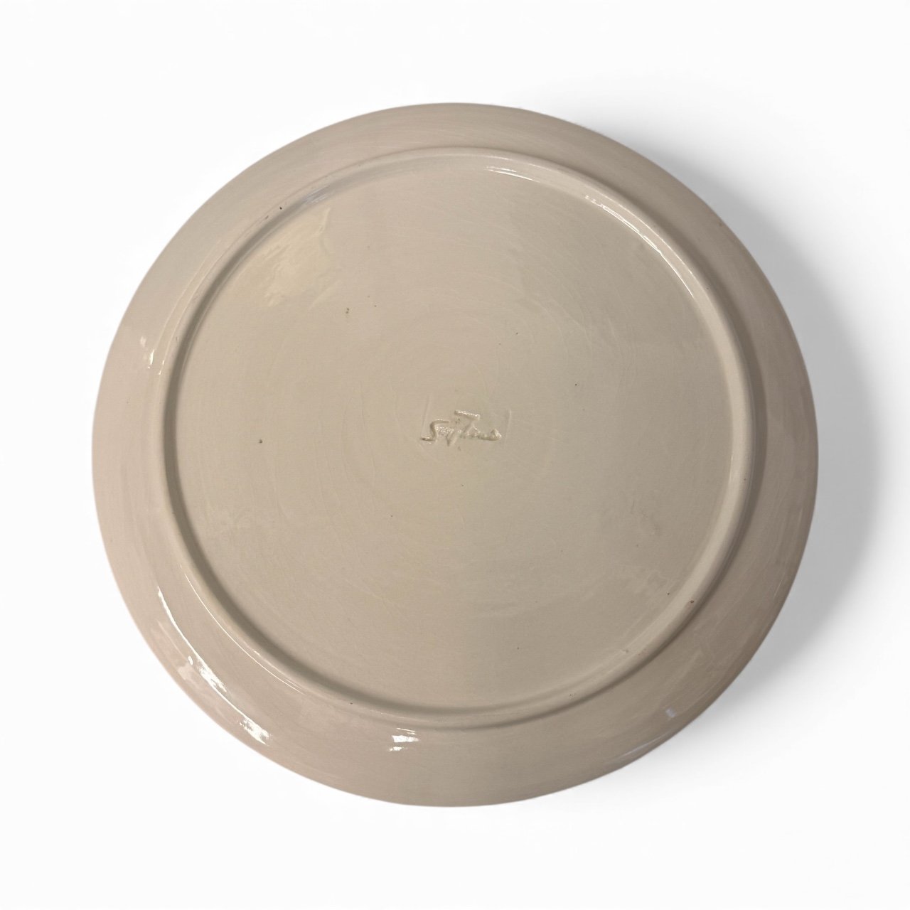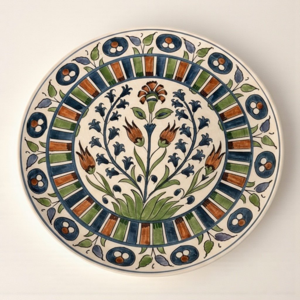 Hand-painted Moroccan ceramic plate featuring a classic floral motif in green, blue, and terracotta on an ivory ground. Perfect for wall display or table styling.
