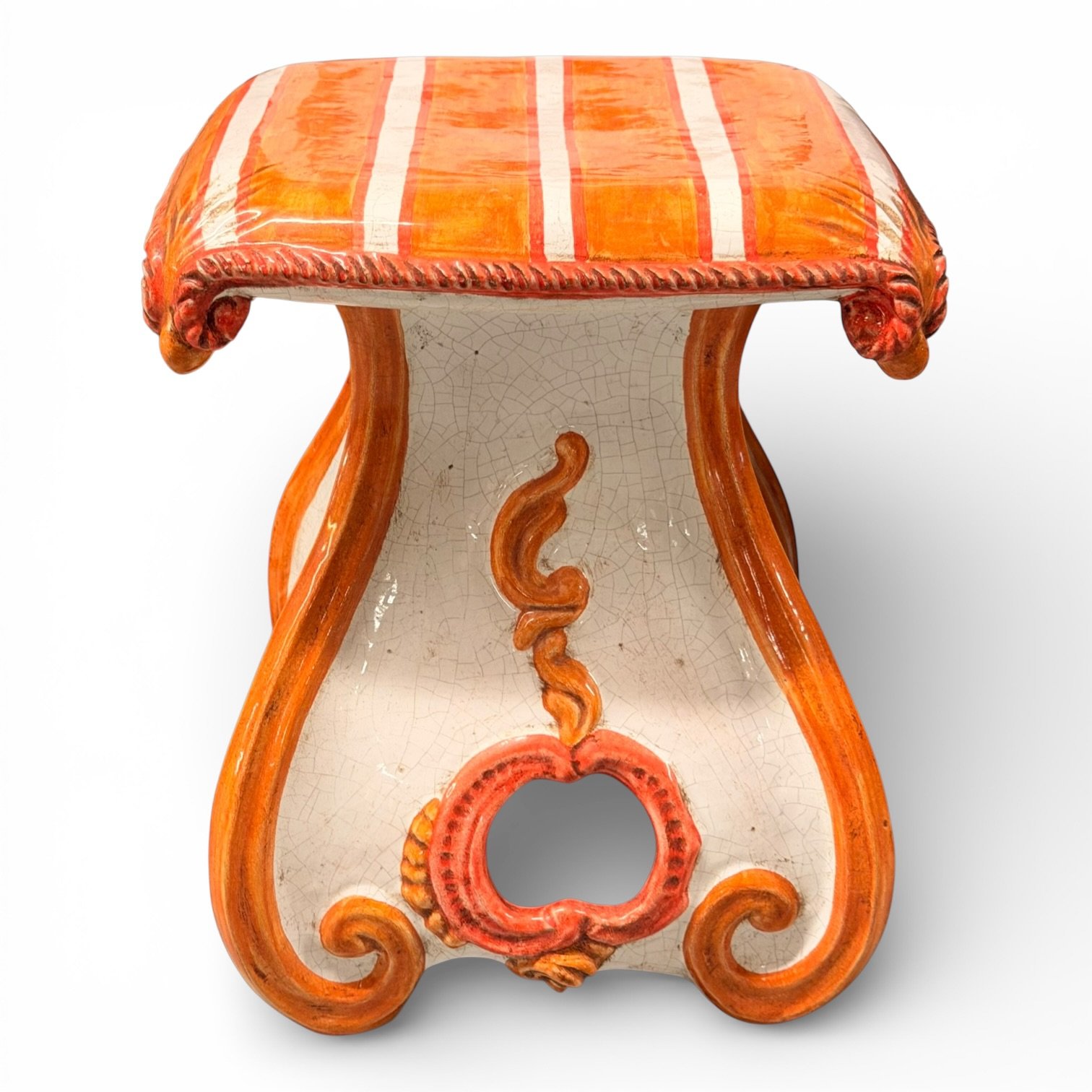 This charming hand-painted Tuscan ceramic stool, signed by Ceccarelli, is a beautiful example of Italian artisan craftsmanship. Featuring soft green and ivory tones with classic scroll detailing and a striped seat, the piece is finished with a delicate crackle glaze that enhances its old-world character.