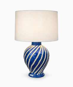 A beautifully handcrafted Italian ceramic table lamp featuring a richly glazed cobalt blue base adorned with sculptural cream spiral banding. The dynamic twisted detailing creates depth and movement, giving the piece a classic Mediterranean yet timeless appeal.