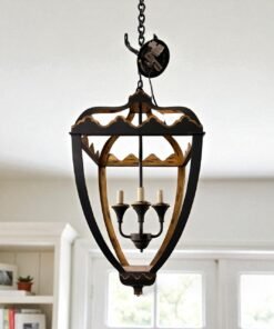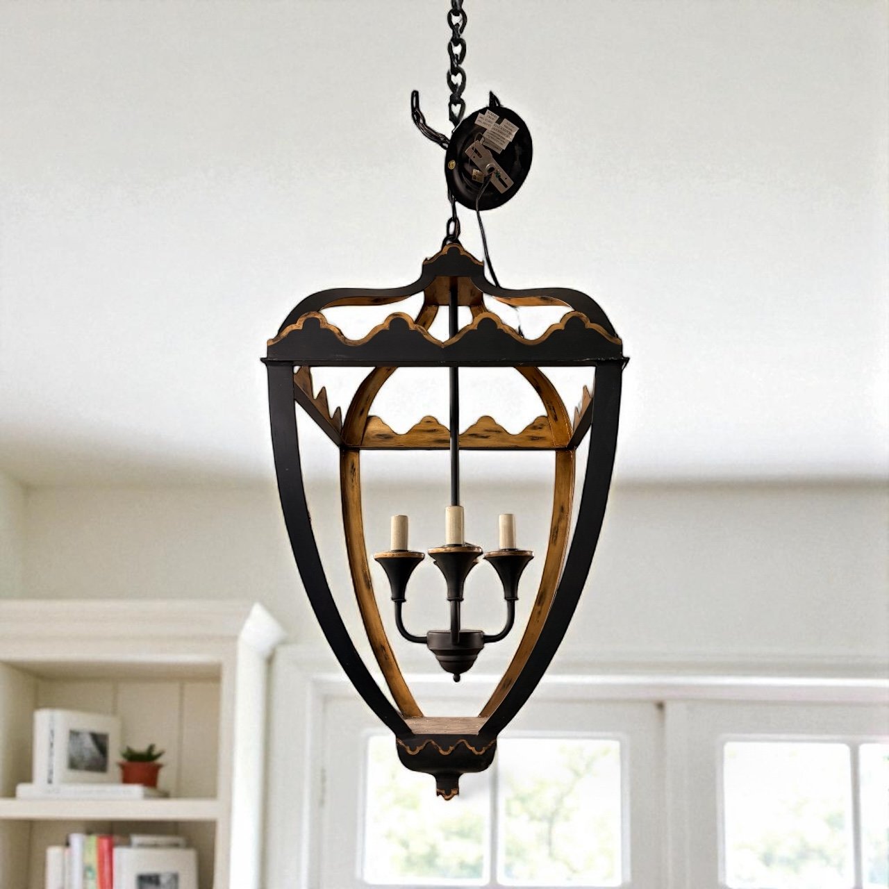A decorative iron chandelier in lantern form, featuring a sculpted frame with gilt scalloped trim and an open design. Inside, two candle-style lights are suspended on scrolling arms, adding both charm and illumination. The combination of dark iron and gold accents gives the piece an elegant contrast, ideal for entryways, dining rooms, or covered outdoor spaces.