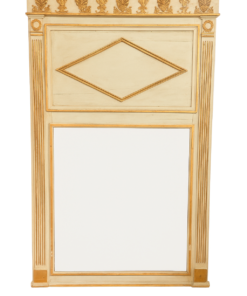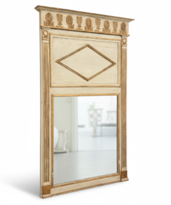 A beautifully detailed wooden mirror with a classic architectural silhouette. The frame features fluted side columns, an inset diamond panel at the top, and a richly carved frieze decorated with shell and foliate motifs. Finished in a softly distressed cream with warm gilded accents, the piece offers elegant texture and depth.