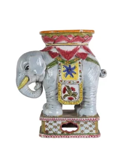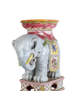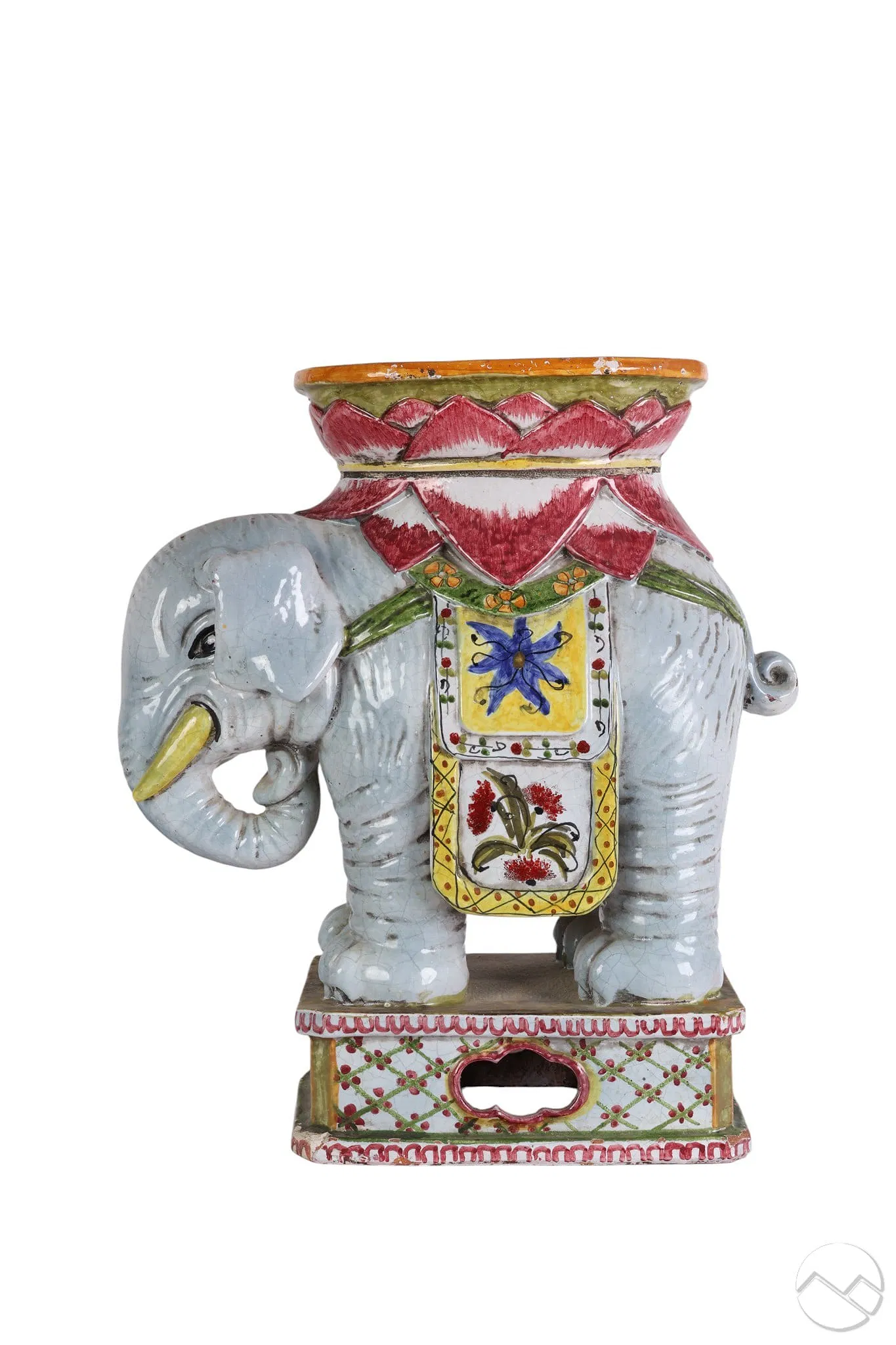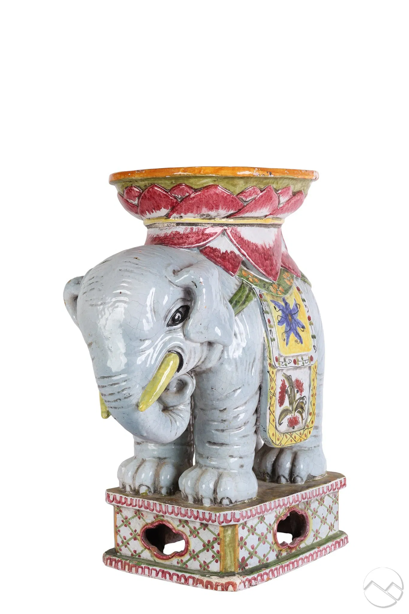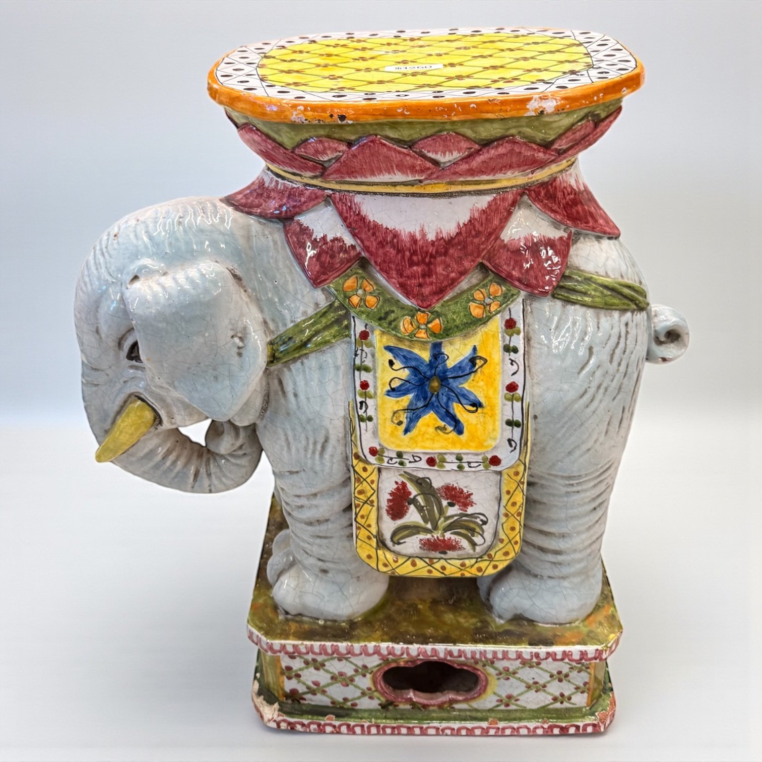 Italian terracotta elephant stool in Hollywood Regency style, finished in vibrant majolica glaze. The sculptural form features a seated elephant with a half-raised trunk positioned between two prominent tusks. A flat-top houda in bright red crowns the back, serving as a functional seat or display surface. The figure is raised on a harlequin-patterned plinth, enhancing its decorative appeal. No apparent maker’s marks observed.