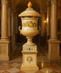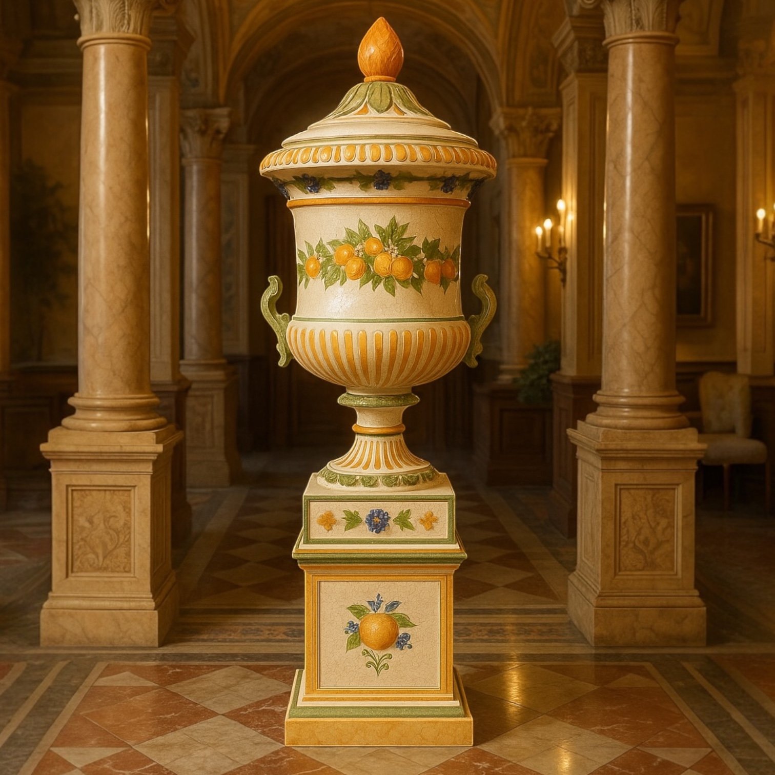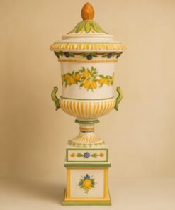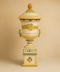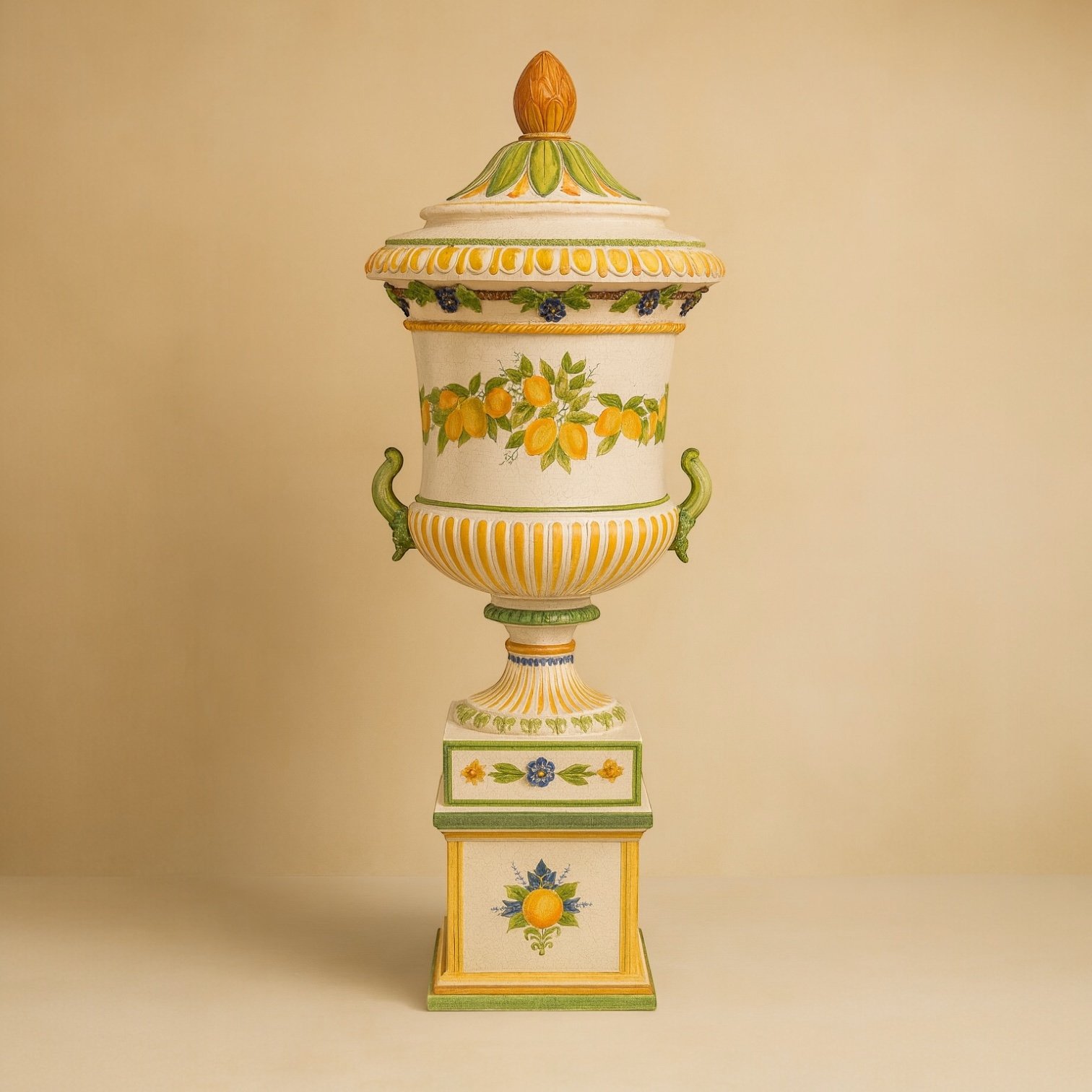 A large and vibrant Italian ceramic urn with lid, beautifully hand-painted with citrus motifs and floral details in rich yellow, green, and cobalt tones. The body is adorned with a garland of lemons and berries, complemented by fluted accents and scrolling green side handles. Resting on a matching square pedestal base with painted floral and fruit panels, the piece exudes the charm of traditional Italian maiolica craftsmanship. Both decorative and functional, it serves as a striking centerpiece for interiors, sunrooms, or garden loggias.