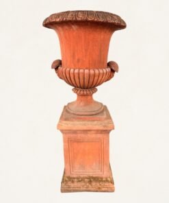 An impressive terracotta urn with classical proportions, set on its original square pedestal base. The urn features a wide flared rim with a decorative egg-and-dart border, a fluted lower body, and bold acanthus-style handles. Its warm terracotta surface shows natural weathering and patina, including moss traces at the pedestal, enhancing its antique character.
