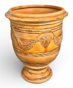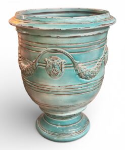 This impressive Anduze-style planter is inspired by classic European garden vessels, featuring elegant relief detailing, traditional garland motifs, and a gracefully flared rim. Crafted in Italy, the planter showcases a beautifully aged glaze with subtle distressing that adds character and old-world charm.