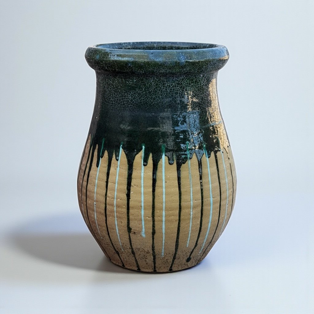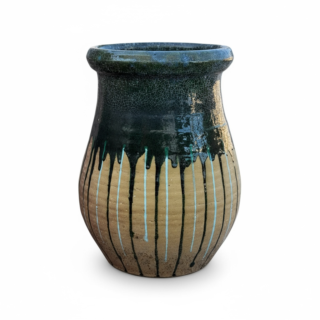 A beautifully shaped large green-glazed jar featuring a classic rounded form with a softly flared rim. The deep green glaze cascades organically over the natural clay body, creating subtle variations, drips, and tonal texture. Its handcrafted character and earthy elegance make it a versatile accent for interiors, patios, or garden rooms.