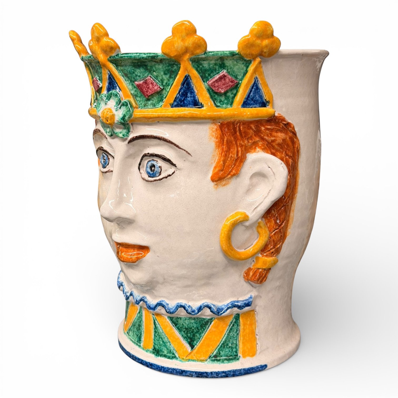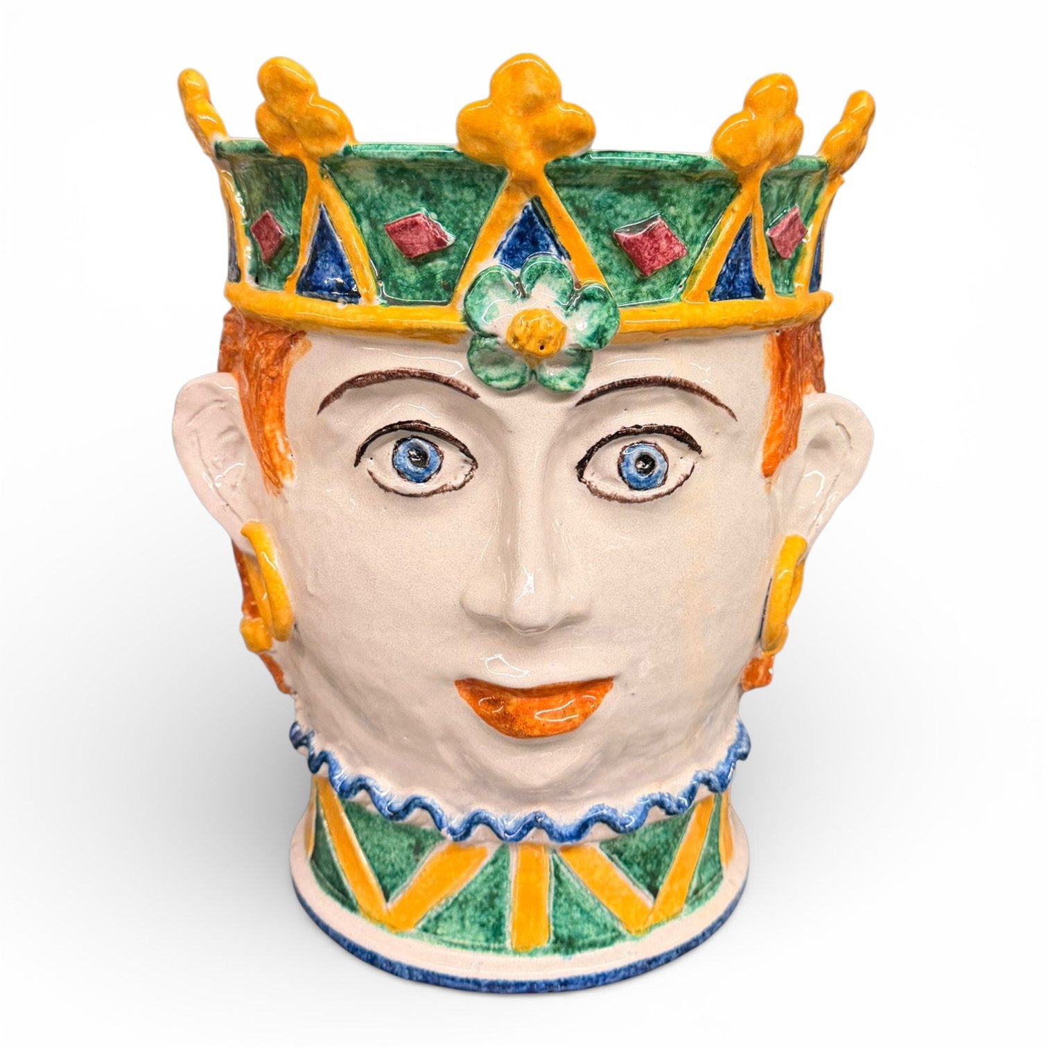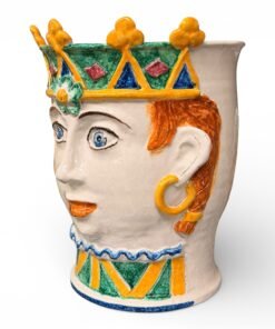 Traditional Sicilian head planters, hand-painted in Italy with a glazed finish and crown detailing. Long associated with Sicilian decorative arts, these sculptural planters are designed to be both functional and decorative, ideal for displaying greenery or as standalone statement pieces.