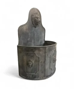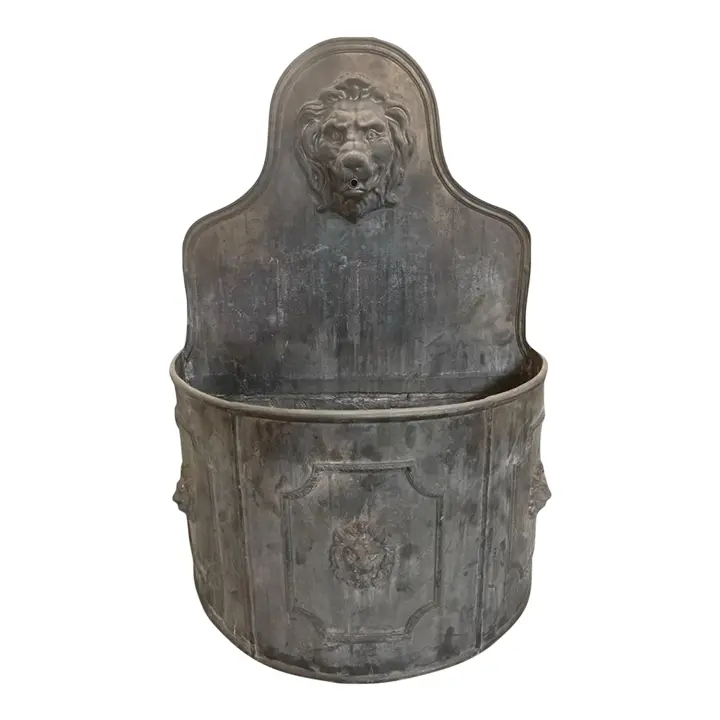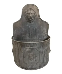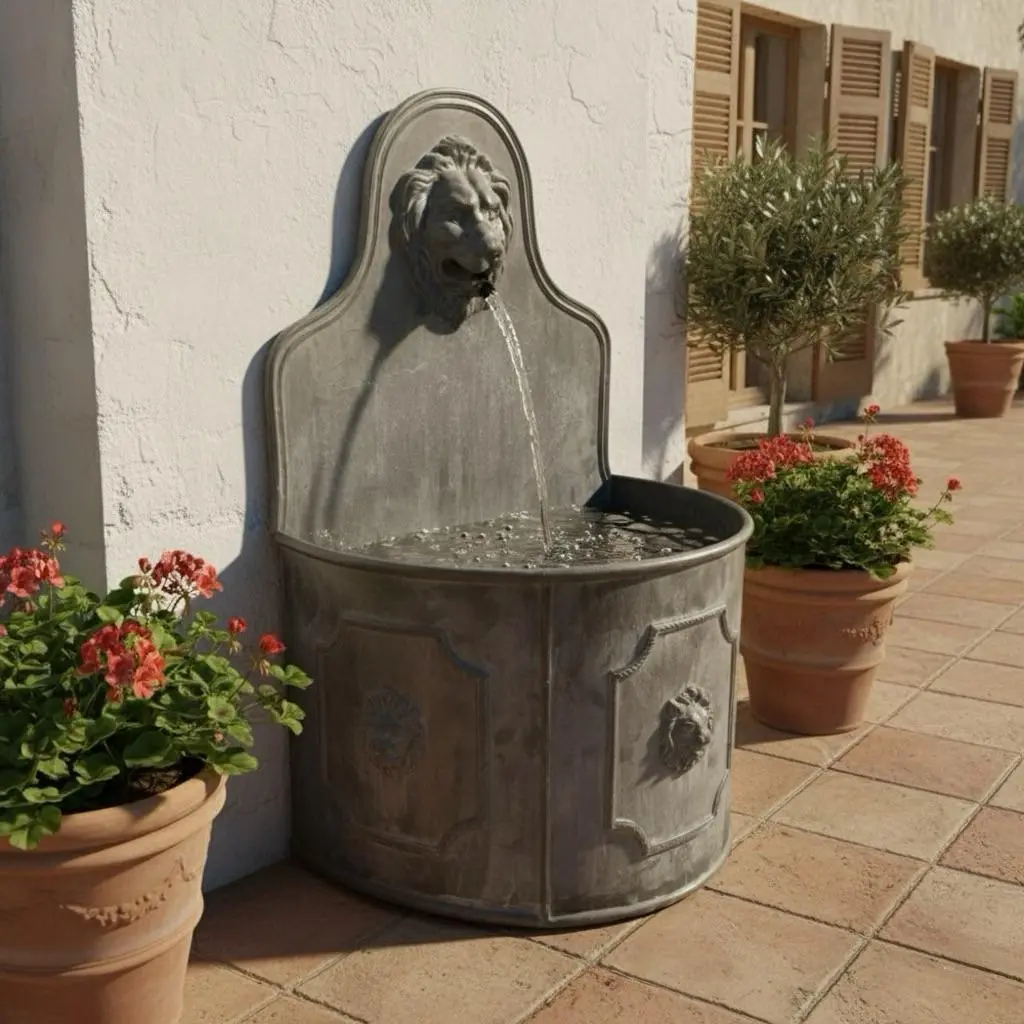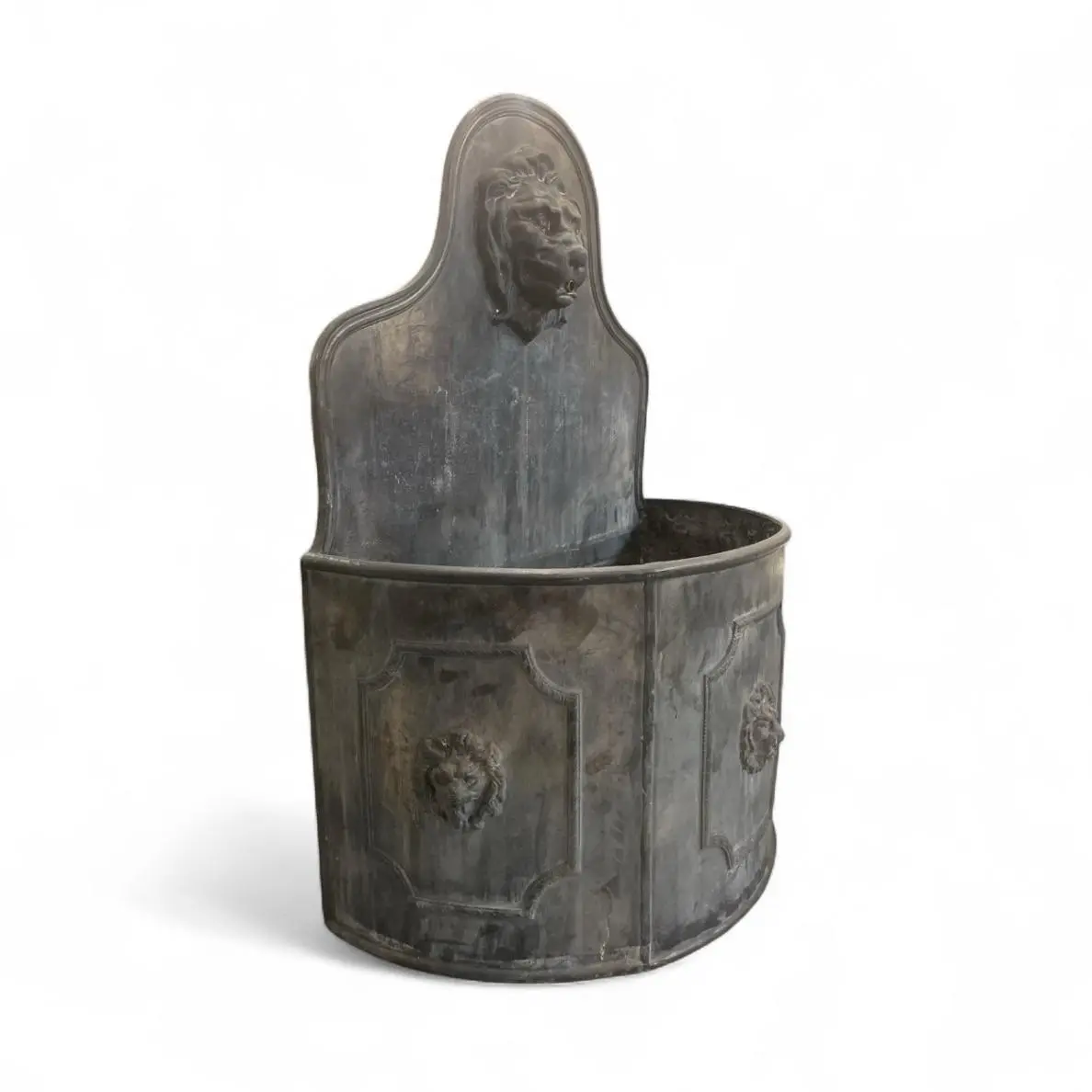 An elegant wall fountain features a finely sculpted lion’s mask on the backplate, a traditional European Lion motif symbolizing strength, guardianship, and timeless sophistication. Water would historically flow from the lion’s mouth into the deep, semi-circular basin below, creating a classic and serene garden focal point.