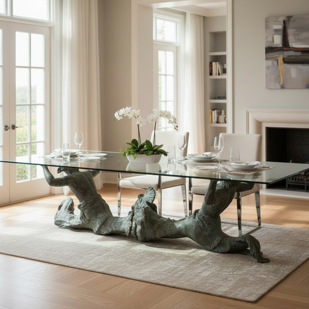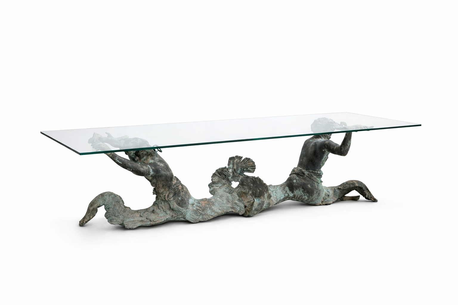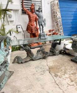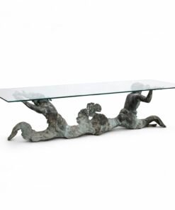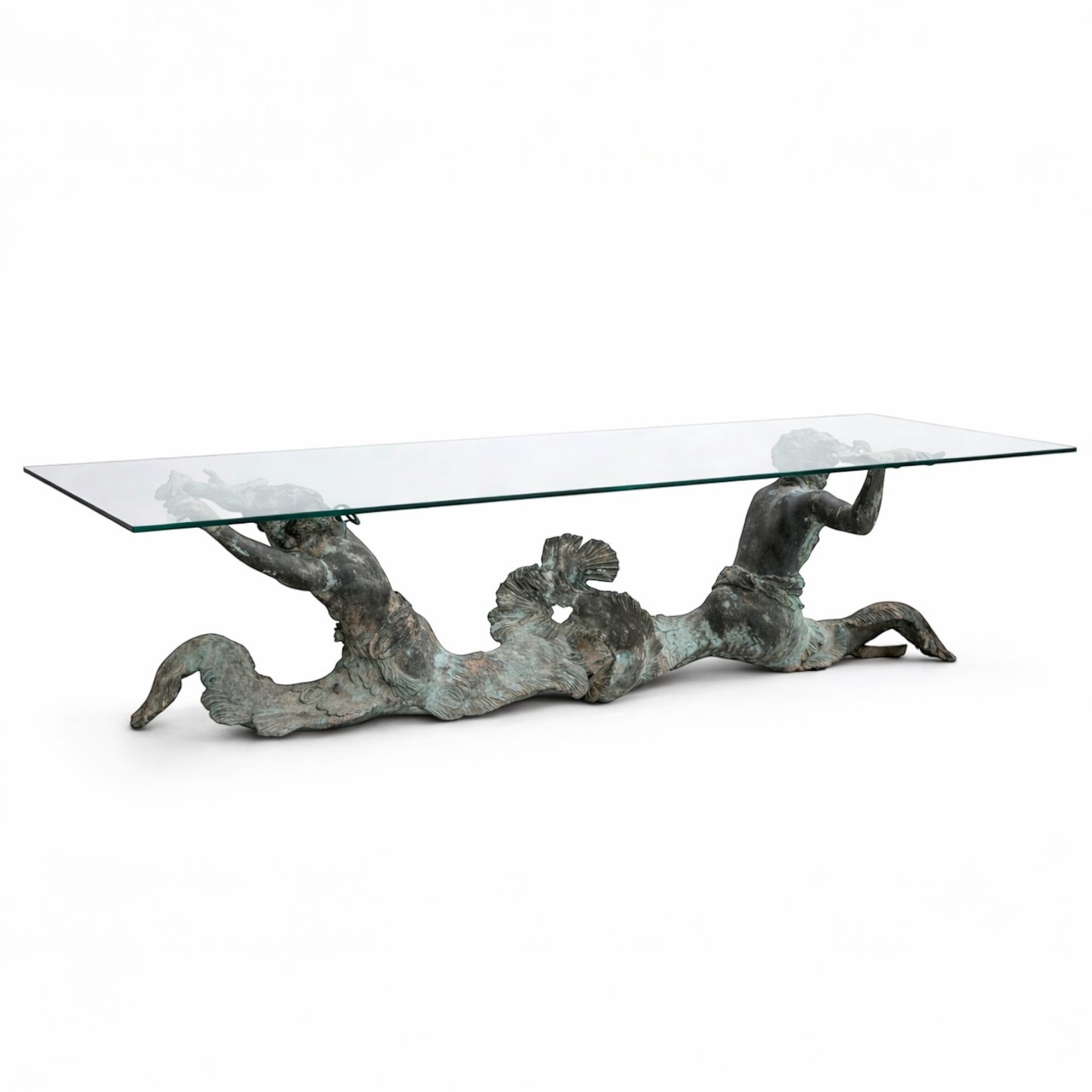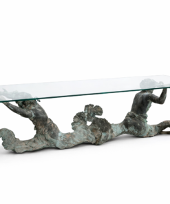 Bring the drama and elegance of the sea into your dining room with this stunning antique-style dining table. The base is crafted from patinated bronze and features a dynamic sculptural depiction of two mermen or tritons (male mermaids in Greek mythology) with intertwined, serpentine tails.