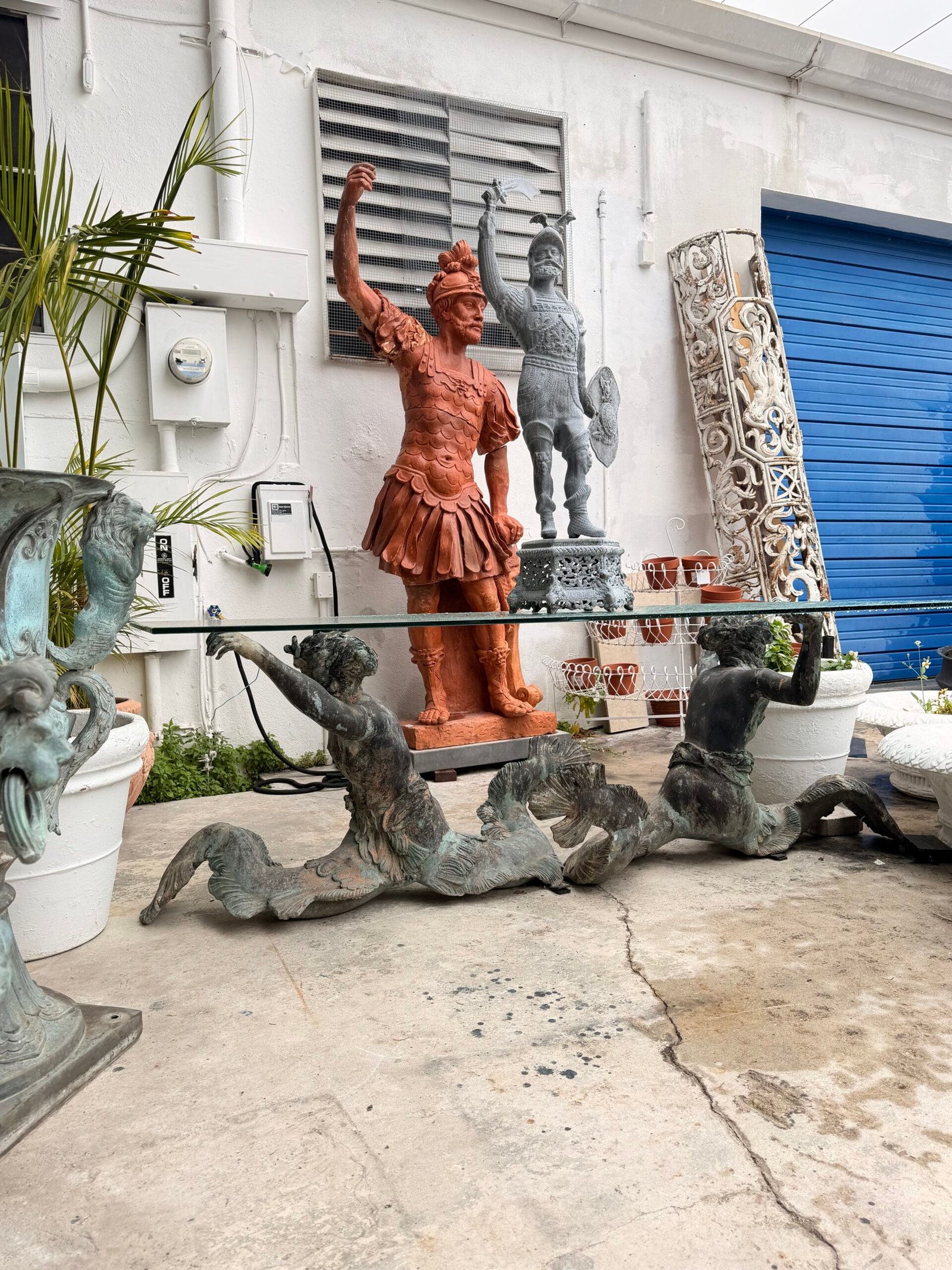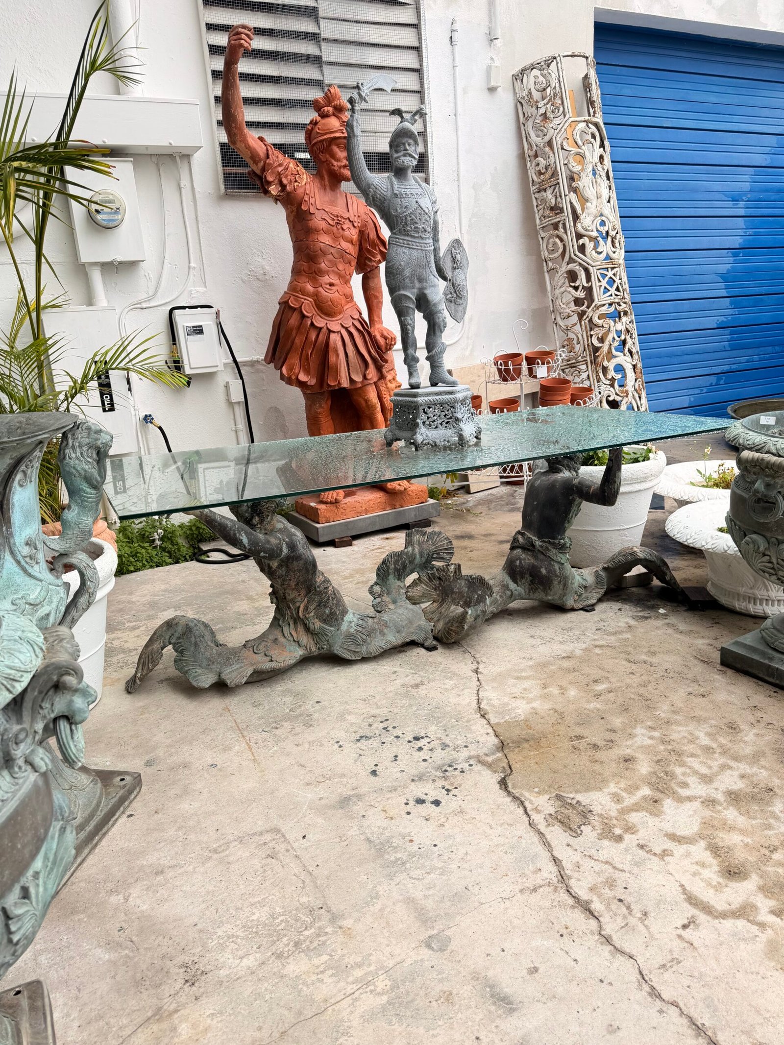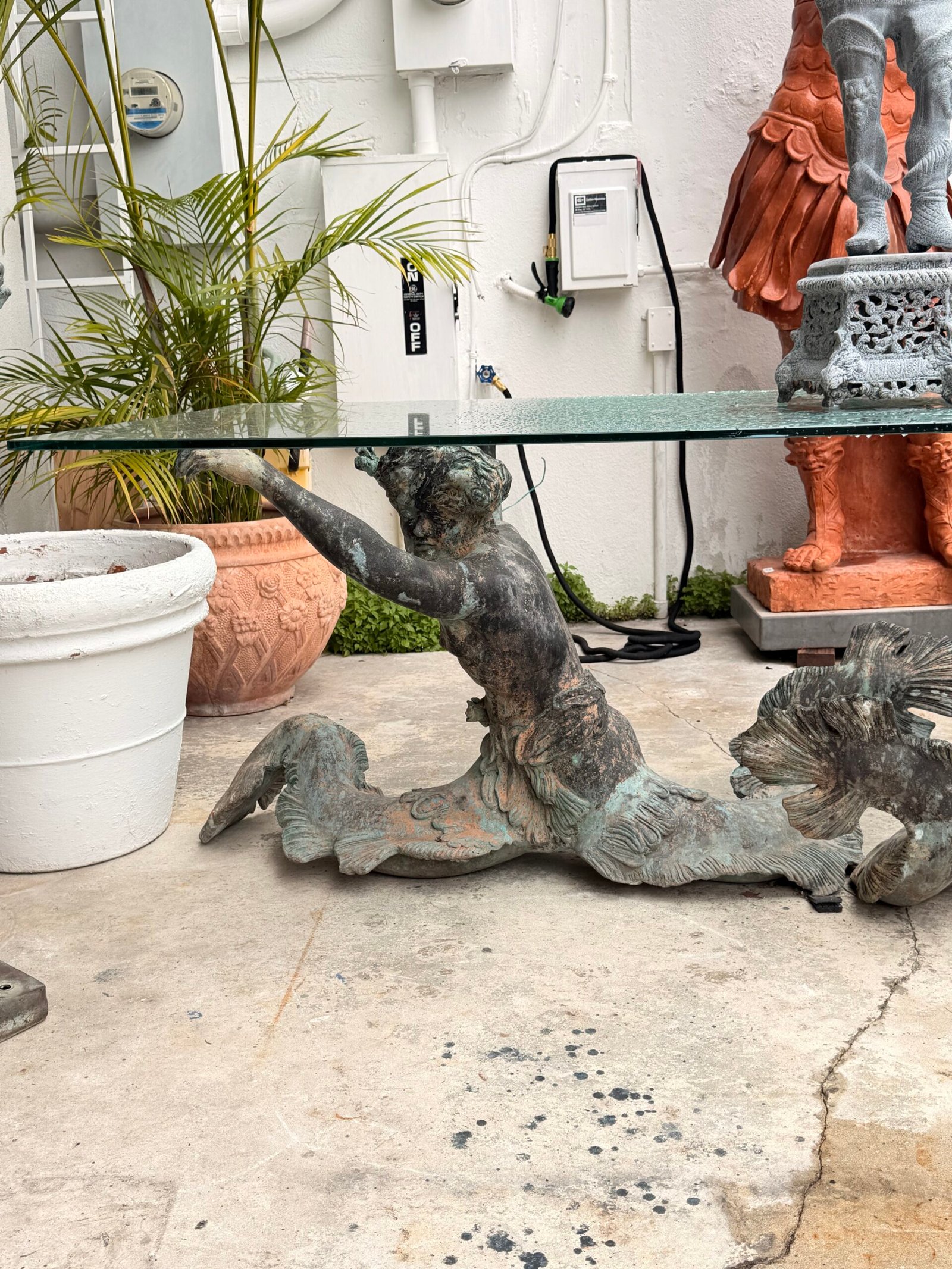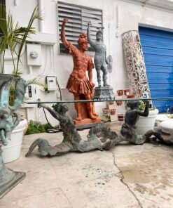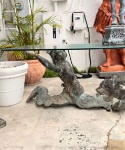Bring the drama and elegance of the sea into your dining room with this stunning antique-style dining table. The base is crafted from patinated bronze and features a dynamic sculptural depiction of two mermen or tritons (male mermaids in Greek mythology) with intertwined, serpentine tails.