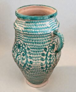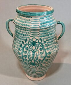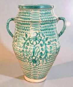 Handcrafted Moroccan ceramic vase featuring a classic amphora form with two side handles. The piece is decorated with hand-painted green patterns and floral motifs over a creamy white background, giving it a vibrant yet timeless Mediterranean character.