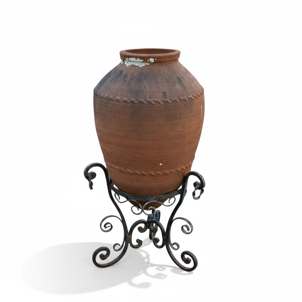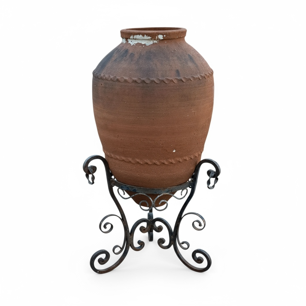 The wrought iron stand adds height, stability, and decorative scrollwork, enhancing the pot’s sculptural presence. Perfect for interiors, patios, entryways, or as a unique statement accent in any Mediterranean- or boho-inspired setting.