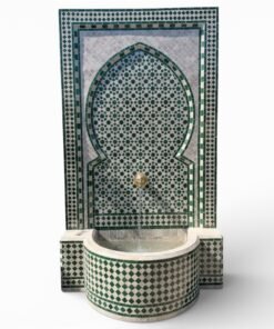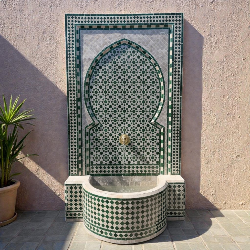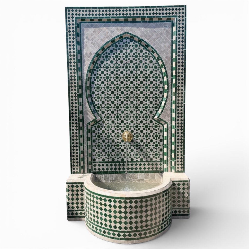 A hand-crafted Moroccan wall fountain featuring traditional zellige mosaic tilework in an elegant green and white palette. The design is centered around a classic Moorish arch motif, framed with intricate geometric borders and finished with a brass spout.