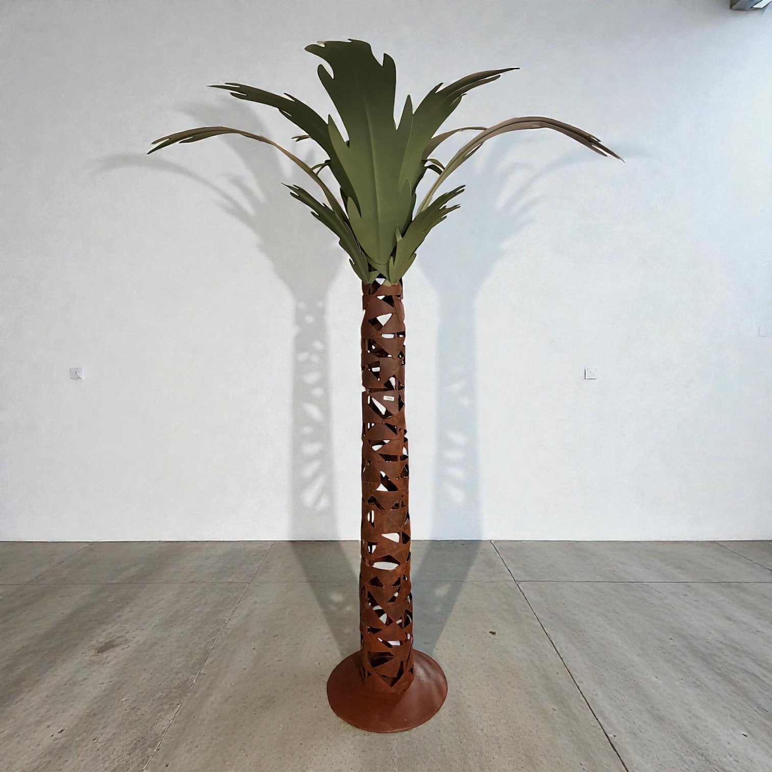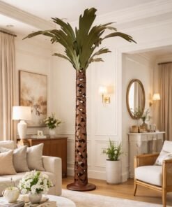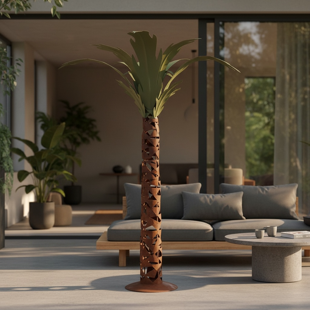 Finished in warm rust-toned metal with green painted leaves, this statement piece brings a bold tropical and architectural presence to an interior, garden room, or covered outdoor space.
