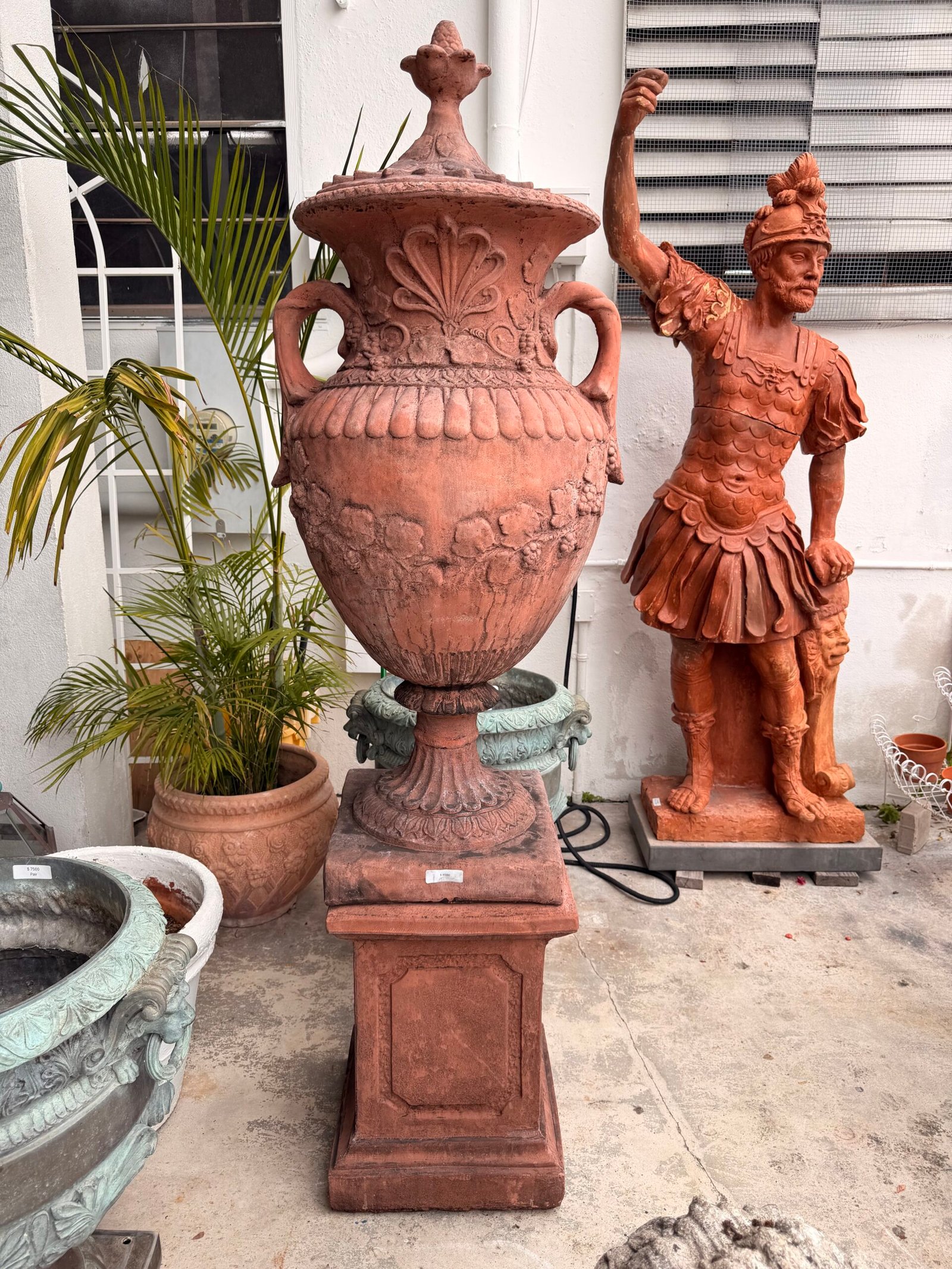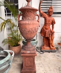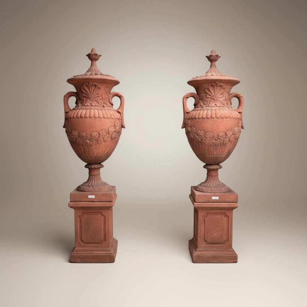 Impressive pair of monumental English stone painted in terra cotta = garden urns on pedestals, standing nearly seven feet tall. Classic amphora form with rich floral detailing—ideal for flanking an entrance or garden stair.