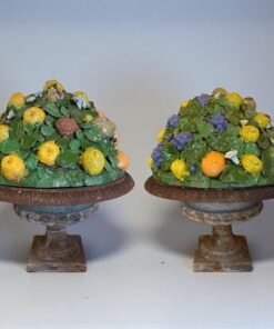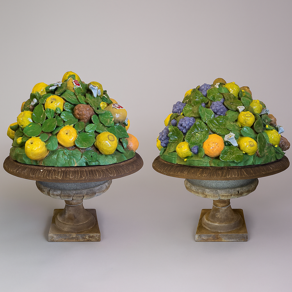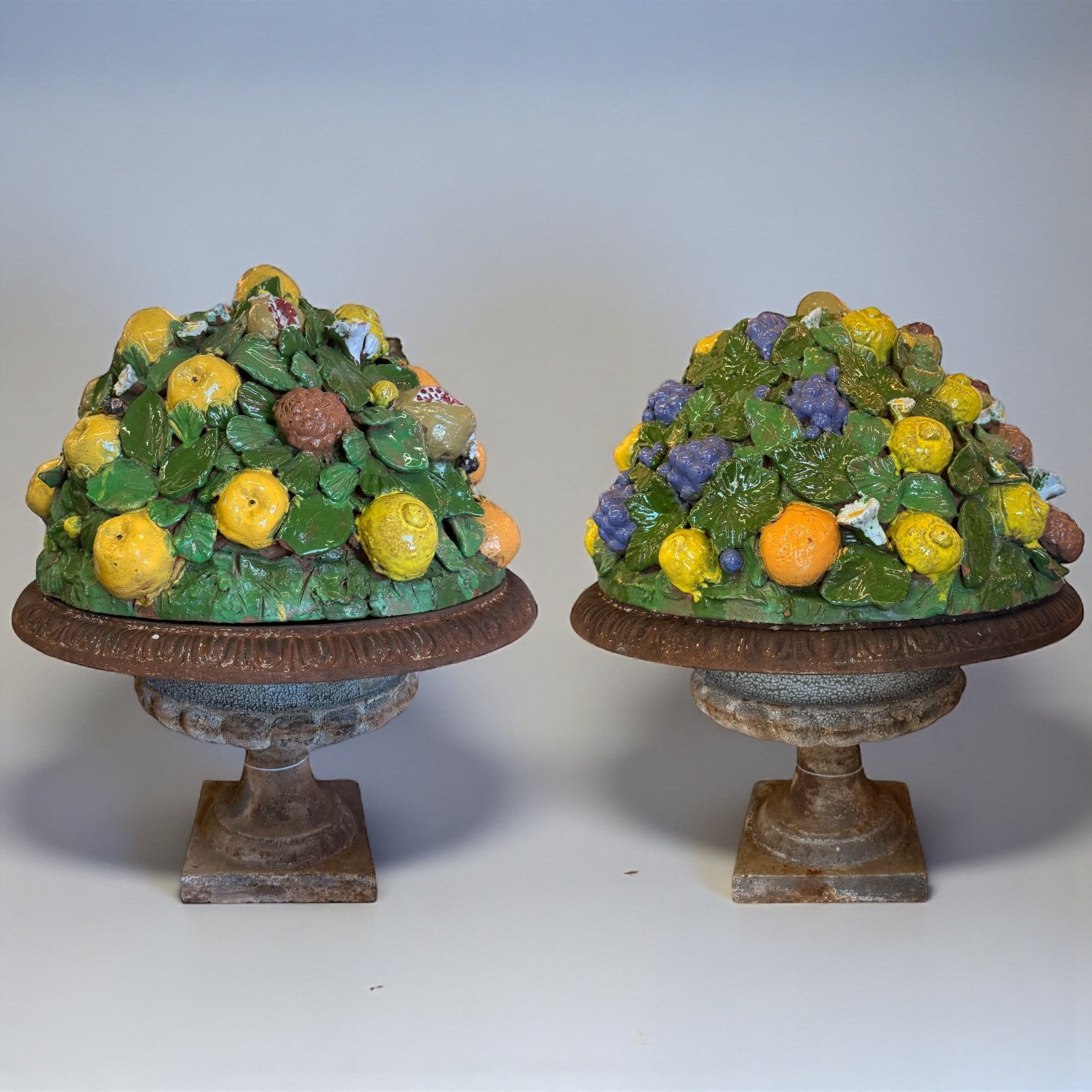 A pair of Antique Cast Iron and Ceramic Urns that beautifully blends antique character with artistic craftsmanship. Each piece features a classic cast iron urn base with an aged patina, lending a sense of history and European garden elegance. Resting atop the urns are hand-crafted ceramic fruit compositions, richly detailed with lemons, grapes, pomegranates, figs, and lush foliage in a lively palette of greens, yellows, purples, and earthy tones.