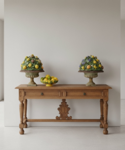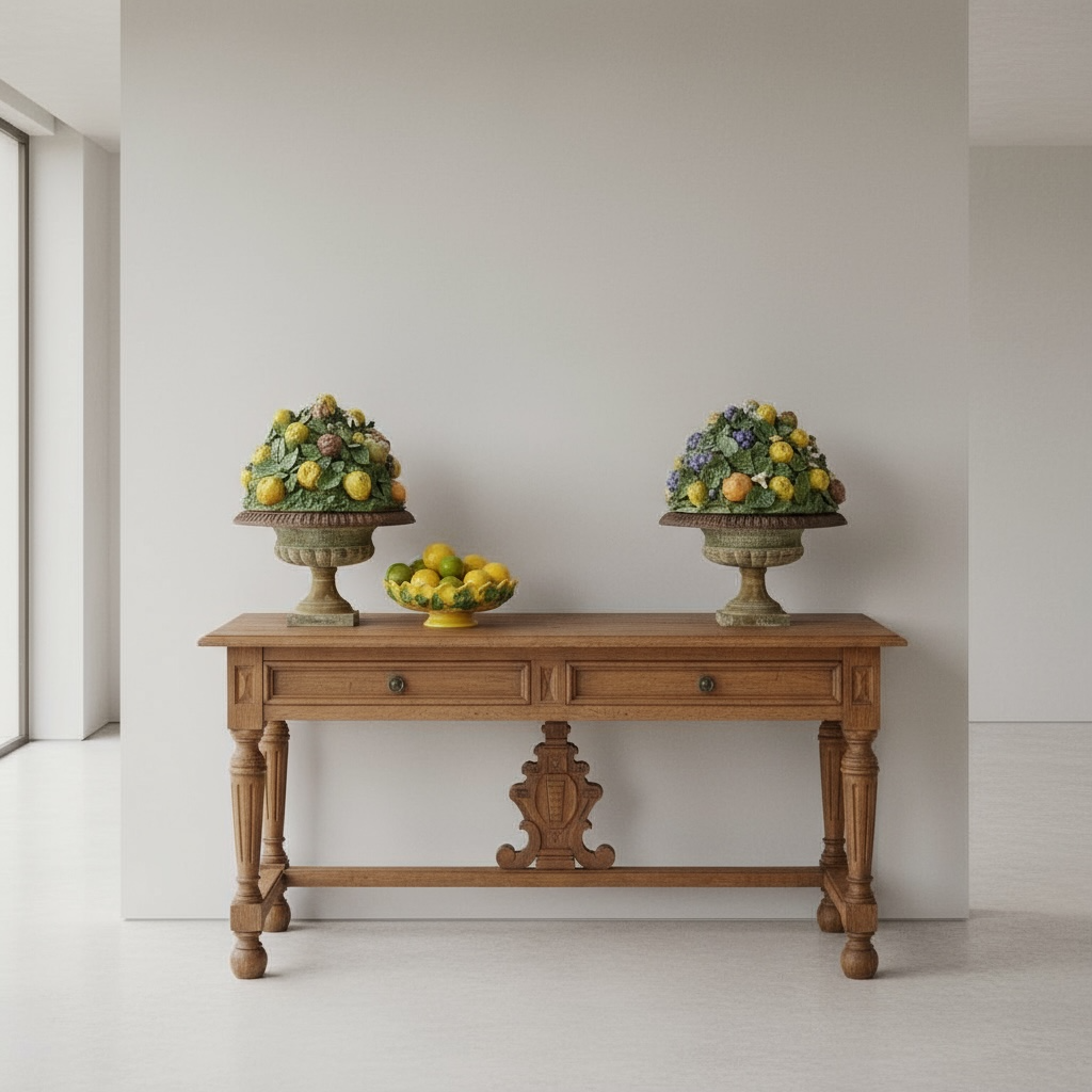 The contrast between the weighty, time-worn iron and the colorful ceramic fruit creates a striking decorative statement, perfect for a dining room console, kitchen island, entryway, or garden-inspired interior. These pieces bring a touch of old-world charm and Mediterranean flair to any space.