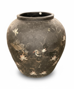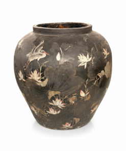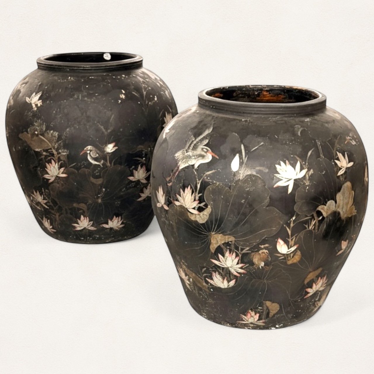 A rare pair of ancient Japanese vases, each hand-painted with delicate depictions of cranes in flight and lotus flowers among water foliage. The surfaces show a beautifully aged character, with soft color fading, worn edges, and natural patina from centuries of use. These marks of time enhance their authenticity, adding depth and a soulful presence that only true antique pieces can convey.