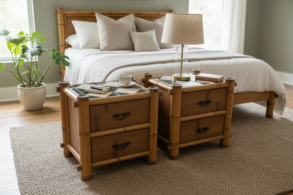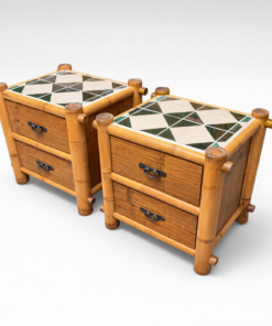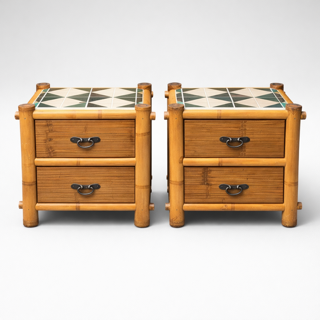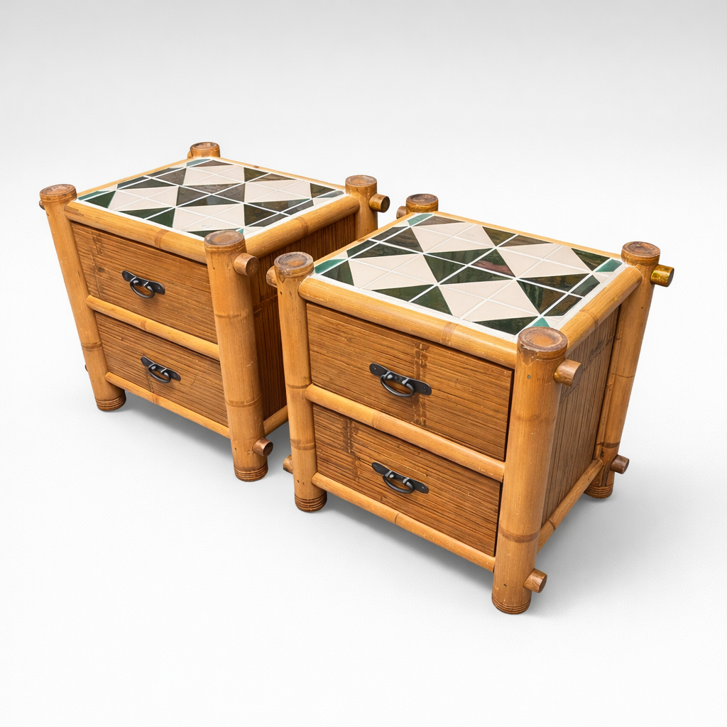 This charming pair of bamboo nightstands features a classic campaign-style silhouette with warm natural wood tones and decorative bamboo corner posts. Each nightstand is topped with a striking geometric tile surface in green, ivory, and charcoal tones, adding texture and a graphic design element.