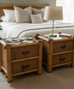 Both pieces include two drawers with dark metal pulls, offering practical storage while maintaining a light, airy look. Perfect for bedrooms, guest rooms, or as side tables in a living space, these nightstands bring a relaxed coastal feel with a subtle Mediterranean touch.