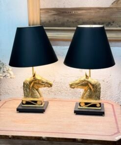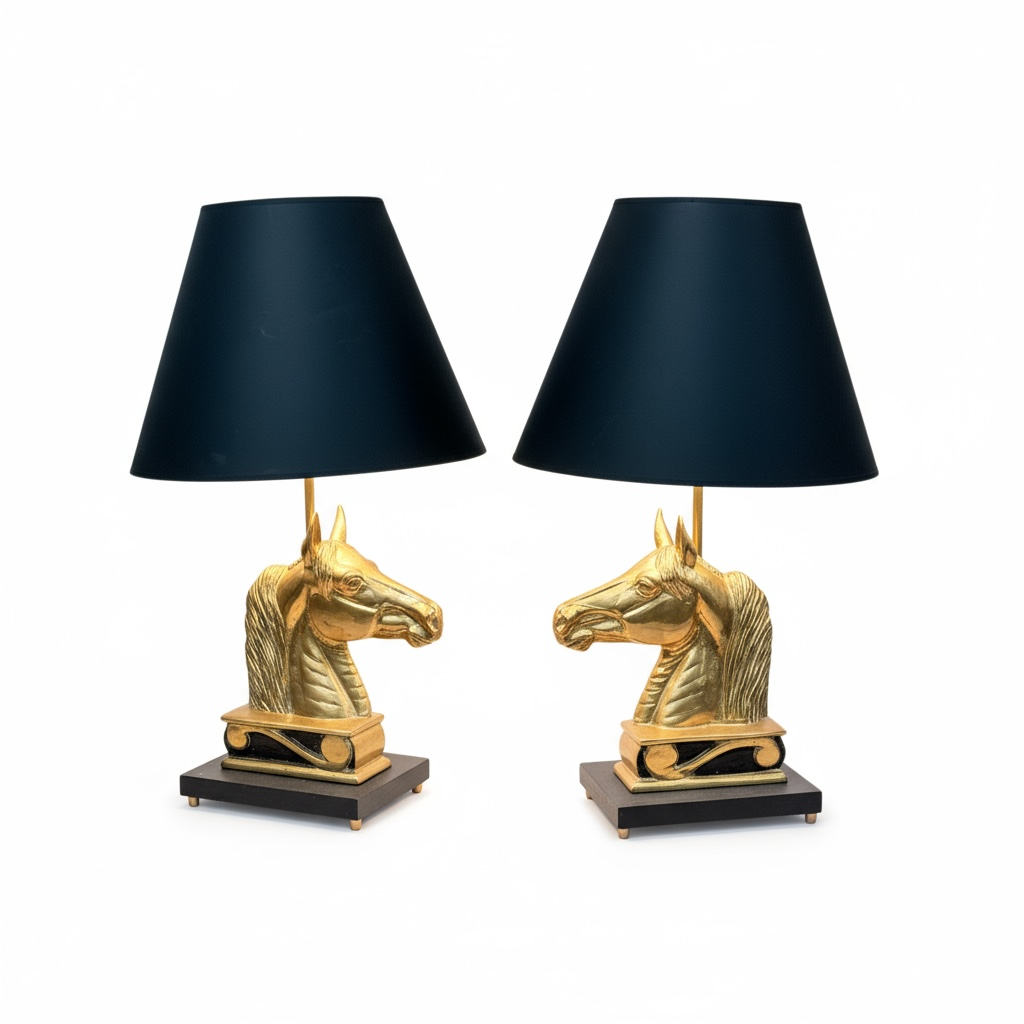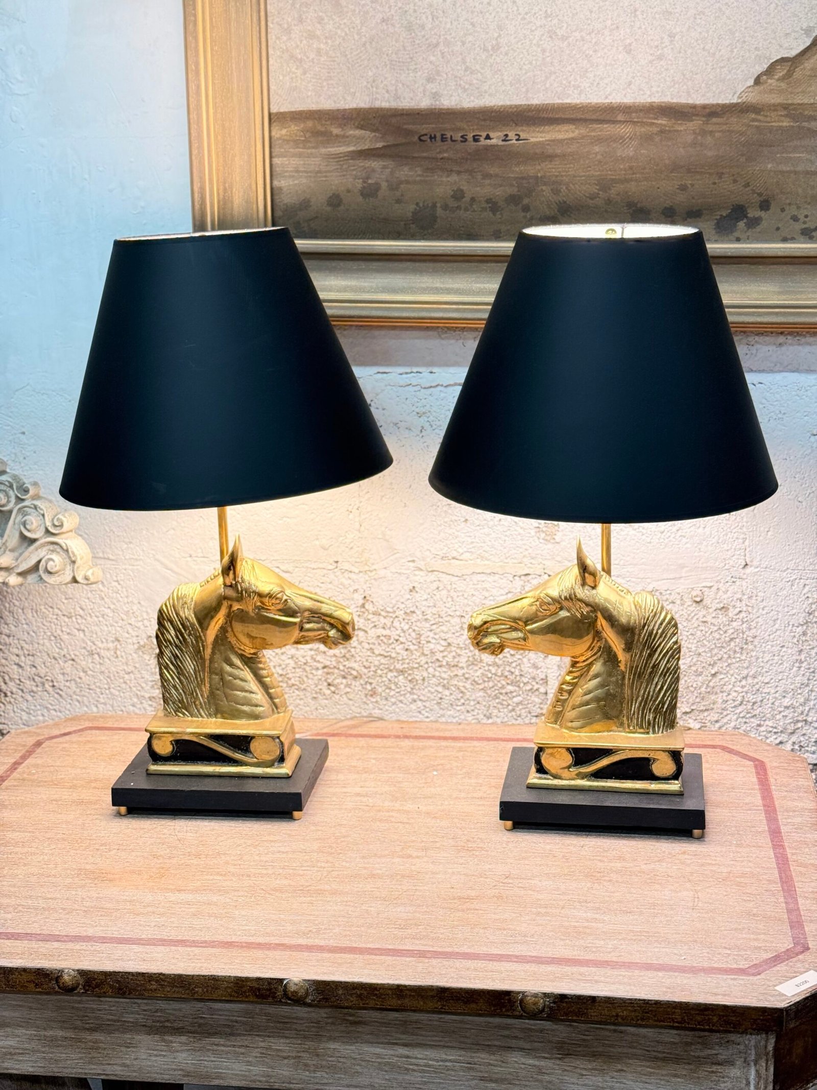 Sophisticated pair of brass horse head table lamps on black bases, complete with black fabric shades. Wired for electricity and sold with shades included. A timeless equestrian accent perfect for a study, library, or console.