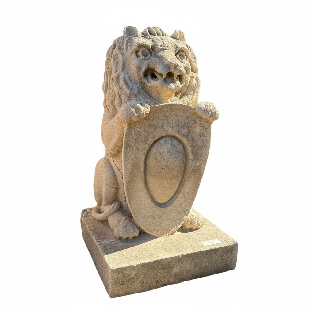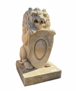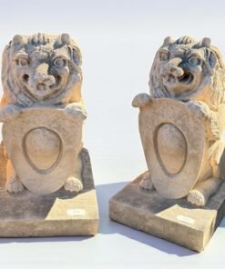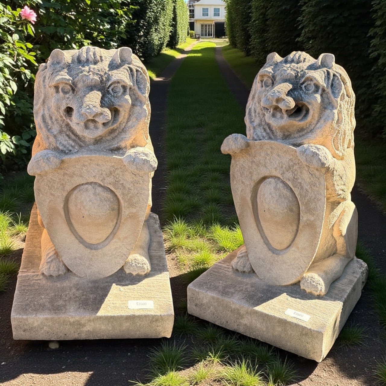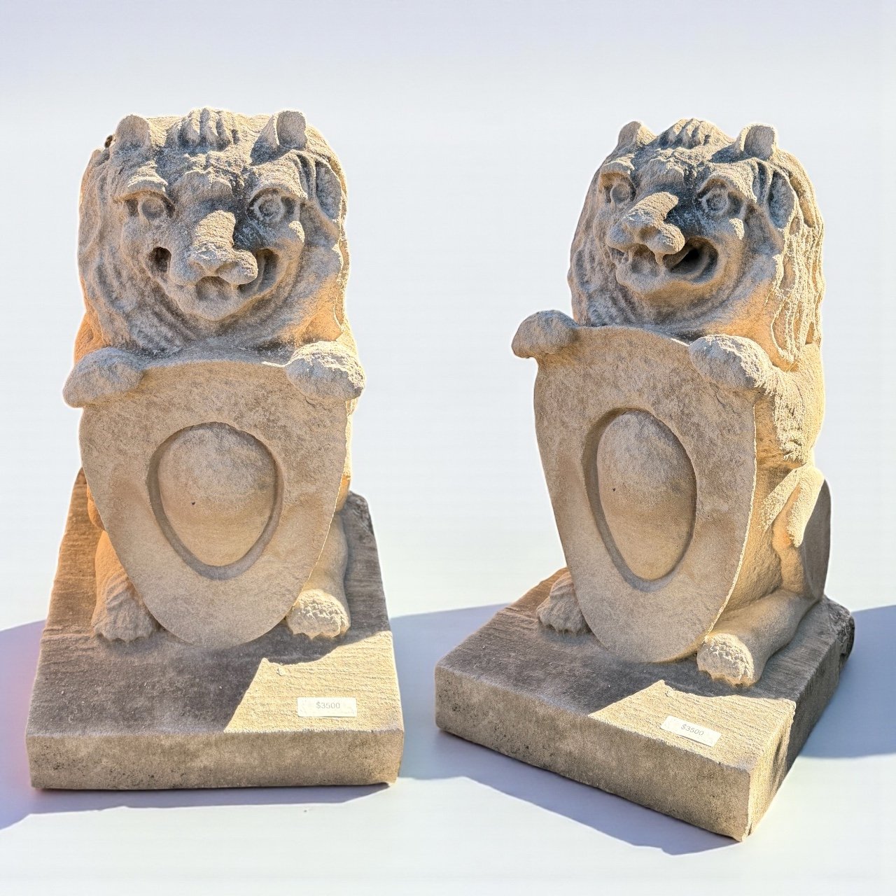 A striking pair of hand-carved sandstone lions, each proudly holding a shield in a classic heraldic pose. Rich in character and sculptural detail, these lions feature expressive faces, finely carved manes, and strong, crouched stances that convey both charm and presence.