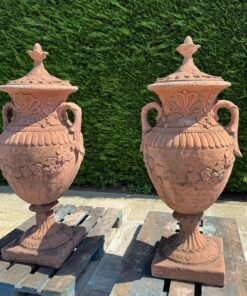 This striking pair of classical cast stone urns brings timeless elegance and architectural beauty to both garden and interior settings. Finished in a warm terracotta tone, these urns are inspired by traditional Greco-Roman design and feature richly sculpted details, gracefully curved handles, and removable lids.