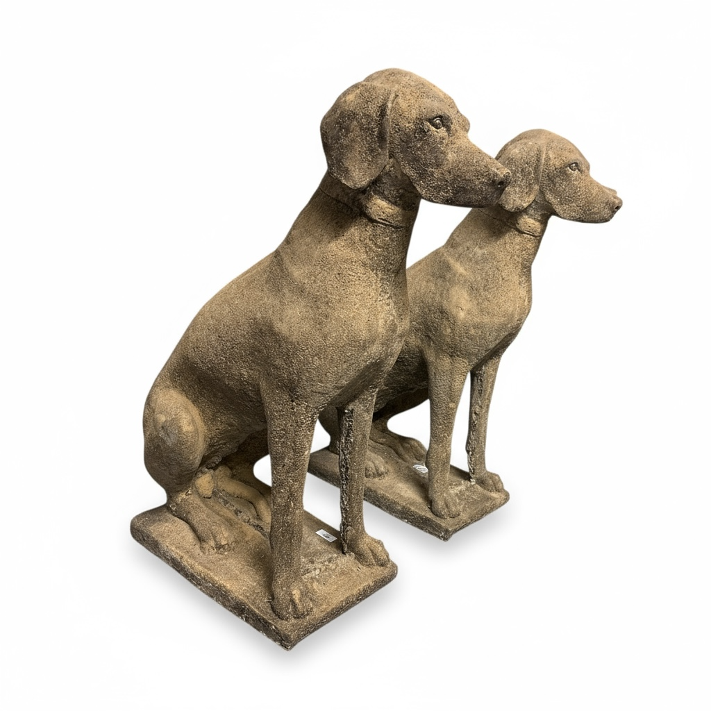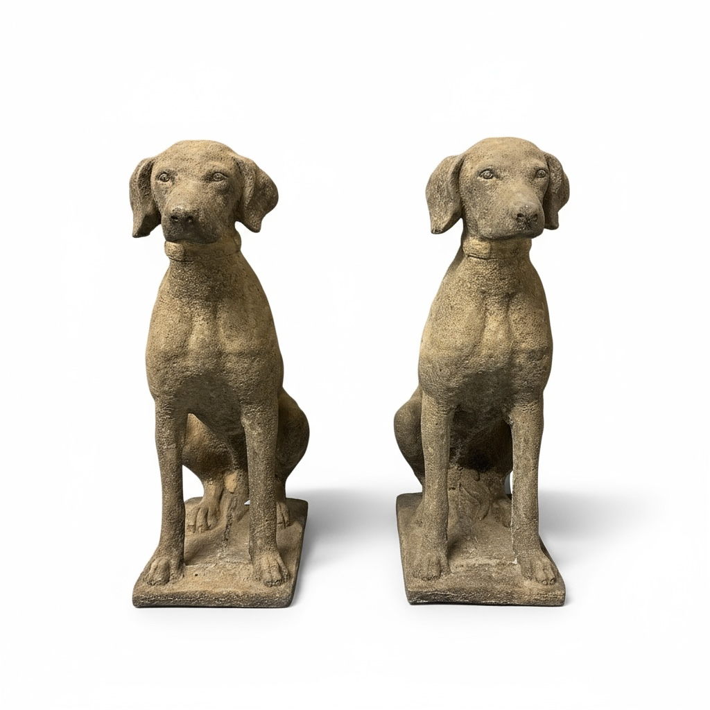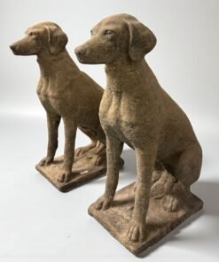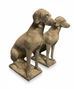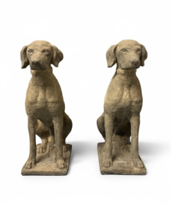A stately pair of English cast-stone Pointer dogs, each seated in a graceful and alert pose. Beautifully detailed and naturally weathered, they exhibit a soft, aged patina that highlights their sculptural form. Perfect for flanking an entryway, garden, or terrace, these timeless figures evoke the elegance and heritage of classic English country estates.