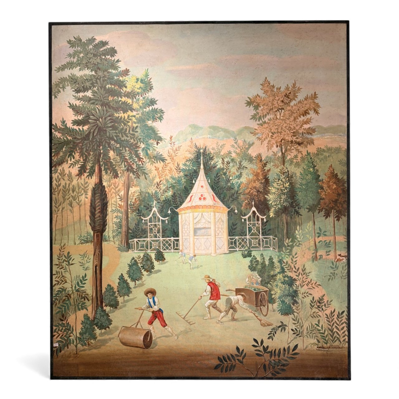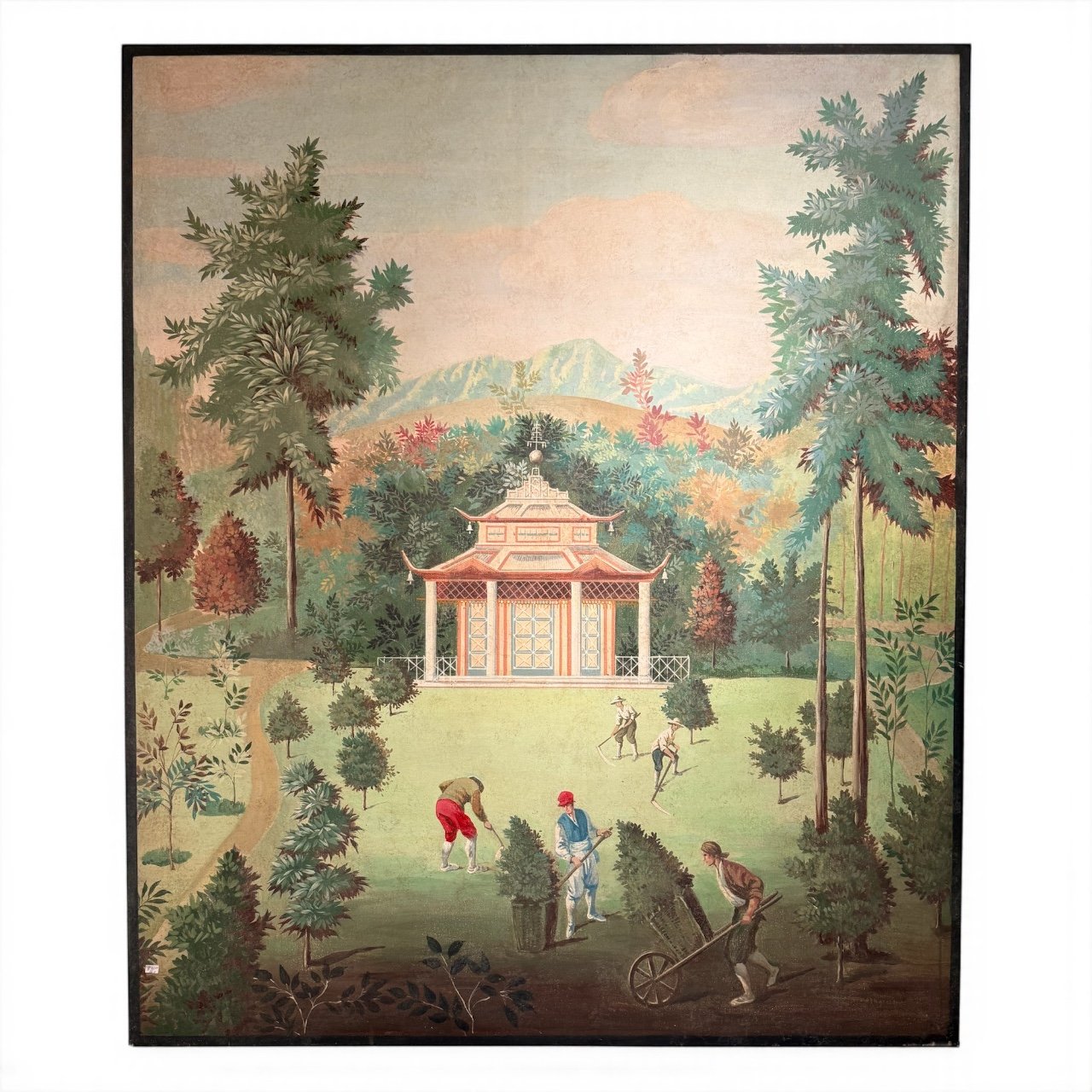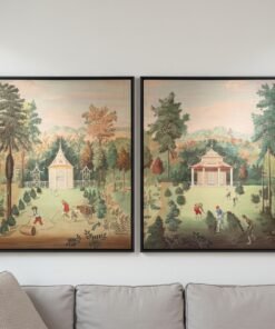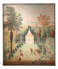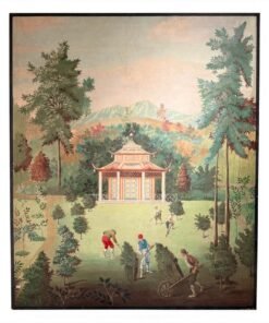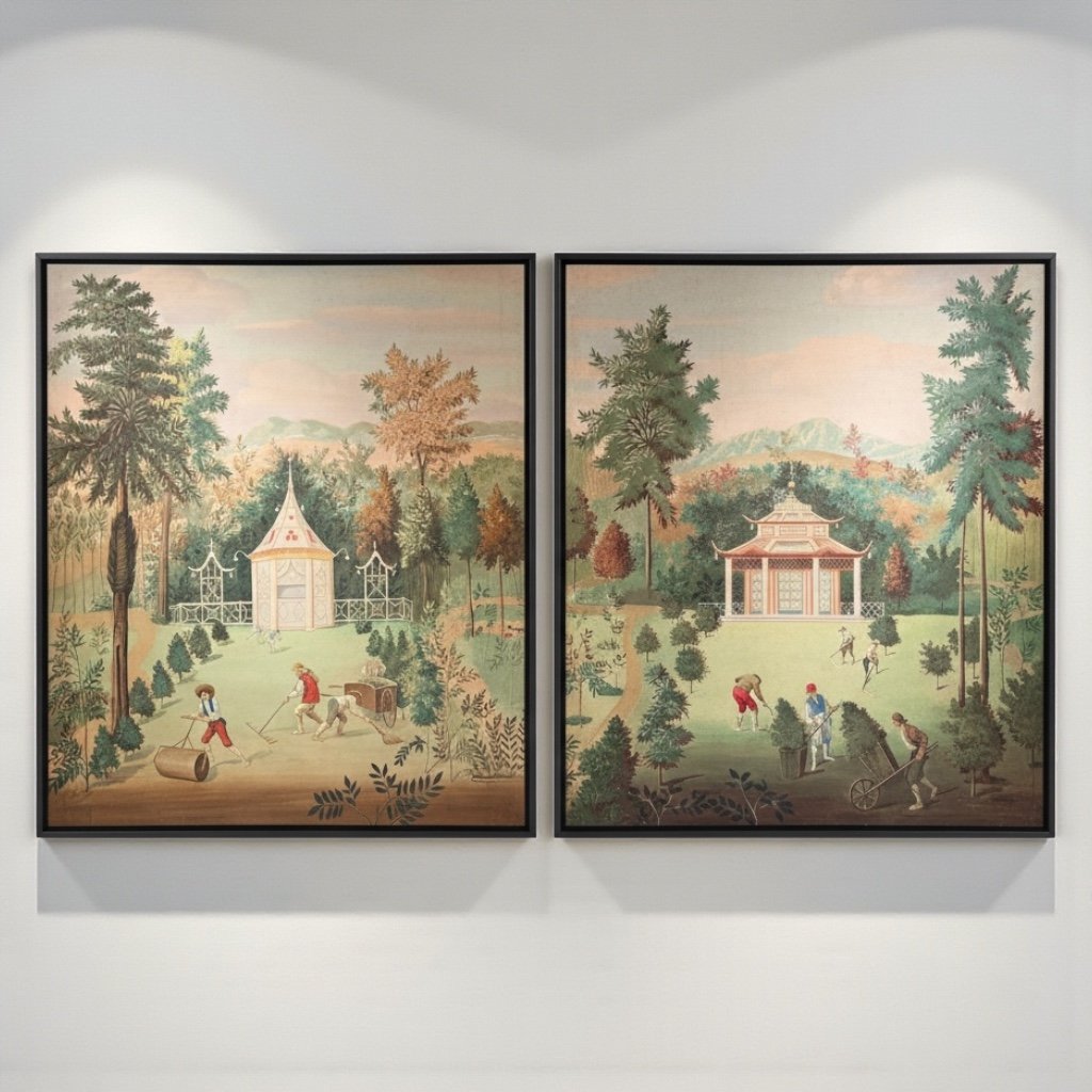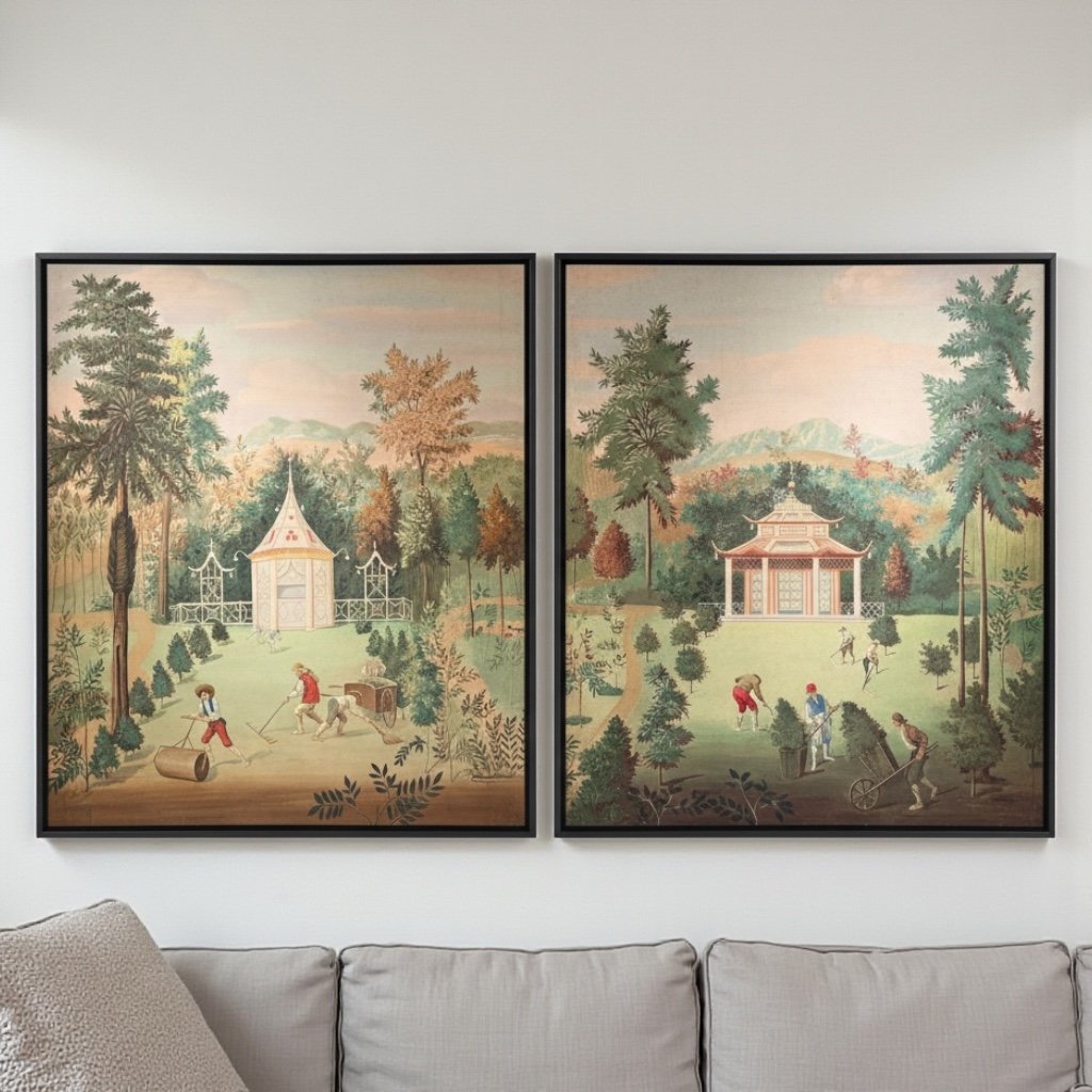 A refined pair of hand-painted chinoiserie panels illustrating idyllic garden scenes with traditional pagoda-style pavilions, lush foliage, and distant mountains. Delicate figures working within the landscape add narrative charm, while the soft, muted palette of greens, blush tones, and warm earth hues creates a serene, timeless atmosphere. Finished in simple black frames, these large-scale panels make an elegant statement in a dining room, entryway, hallway, or formal living space.