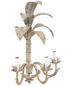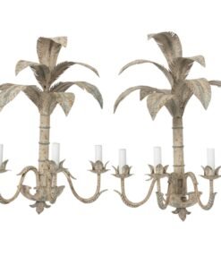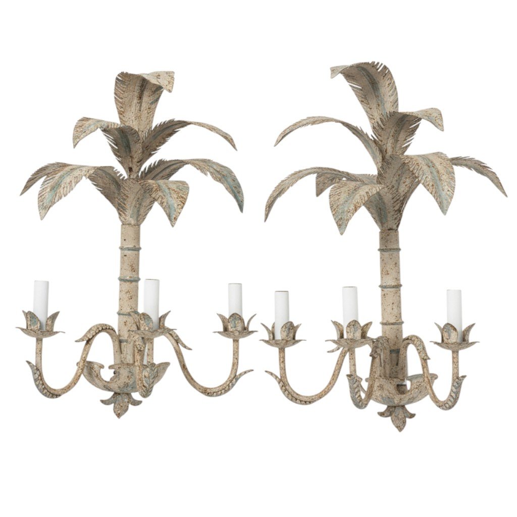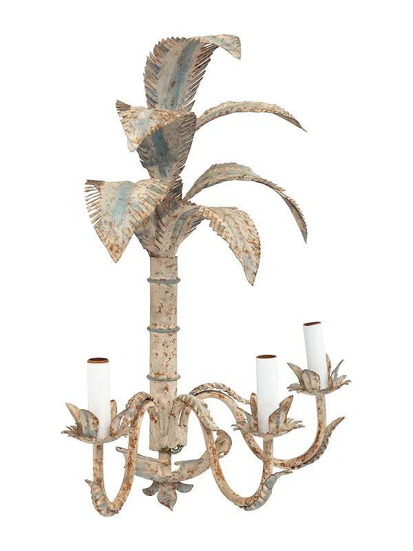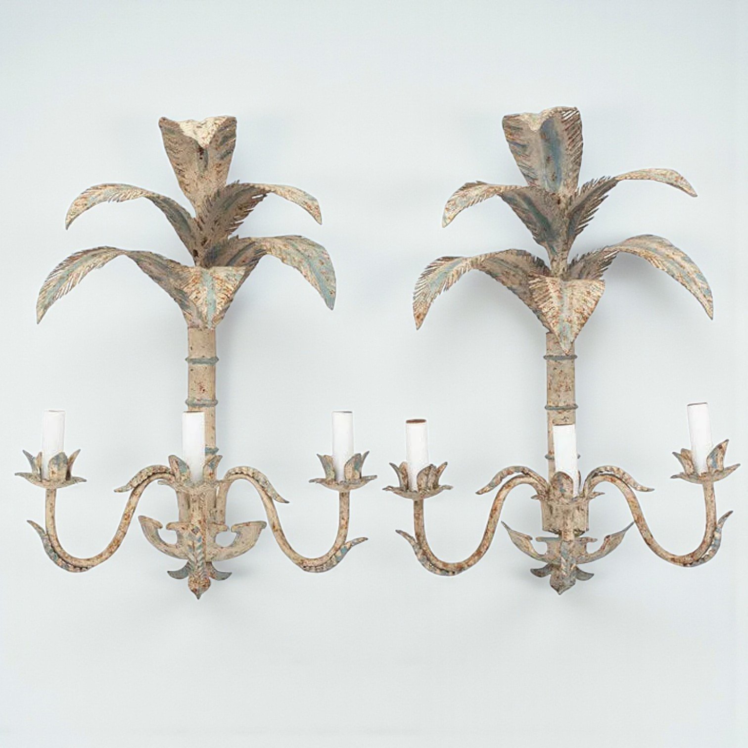A charming pair of Italian painted tole wall sconces, each designed in the form of stylized palm trees with gracefully layered fronds. Finished in a soft cream tone with subtle light blue accents, the metalwork showcases delicate hand-painted detailing and a warm, time-worn patina that enhances their decorative appeal. Each sconce features two lights, set on scrolling arms with leaf-form bobeches, and is wired for electricity.